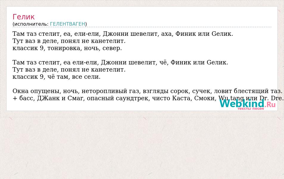 Там таз стелит, еа, ели-ели, Джонни шевелит, аха, Финик или Gелик. Тут ваз в деле, понял не канетелит. классик 9, тонировка, ночь, север. Там таз стелит, еа ели-ели, Джонни шевелит, чё, Финик или Gелик. Тут ваз в деле, понял не канетелит. классик 9, чё там, все сели. Окна опущены, ночь, неторопливый газ, взгляды сорок, сучек, ловит блестящий таз. + басс, ДЖанк и Смаr, опасный саундтрек, чисто Каста, Смоки, Wu tang или Dr. Dre.