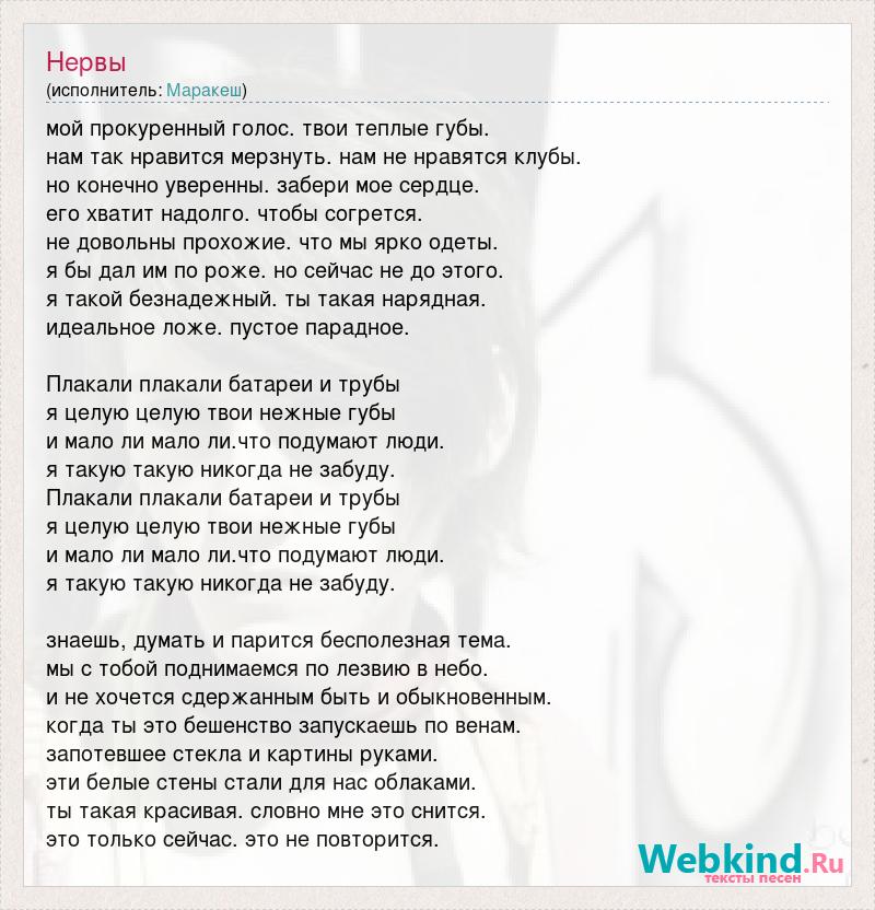 мой прокуренный голос. твои теплые губы. нам так нравится мерзнуть. нам не нравятся клубы. но конечно уверенны. забери мое сердце. его хватит надолго. чтобы согрется. не довольны прохожие. что мы ярко одеты. я бы дал им по роже. но сейчас не до этого. я такой безнадежный. ты такая нарядная. идеальное ложе. пустое парадное. Плакали плакали батареи и трубы я целую целую твои нежные губы и мало ли мало ли.что подумают люди. я такую такую никогда не забуду. Плакали плакали батареи и трубы я целую целую твои нежные губы и мало ли мало ли.что подумают люди. я такую такую никогда не забуду. знаешь, думать и парится бесполезная тема. мы с тобой поднимаемся по лезвию в небо. и не хочется сдержанным быть и обыкновенным. когда ты это бешенство запускаешь по венам. запотевшее стекла и картины руками. эти белые стены стали для нас облаками. ты такая красивая. словно мне это снится. это только сейчас. это не повторится.