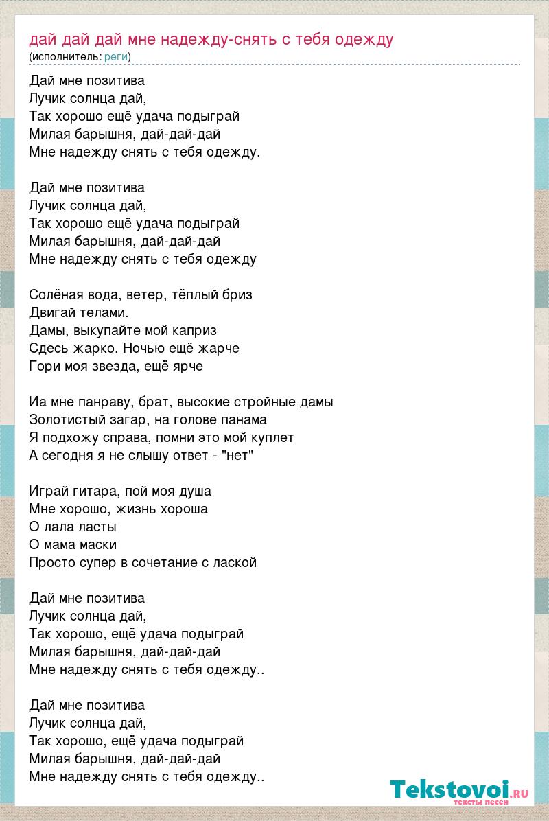 Дай мне позитива Лучик солнца дай, Так хорошо ещё удача подыграй Милая барышня, дай-дай-дай Мне надежду снять с тебя одежду. Дай мне позитива Лучик солнца дай, Так хорошо ещё удача подыграй Милая барышня, дай-дай-дай Мне надежду снять с тебя одежду Солёная вода, ветер, тёплый бриз Двигай телами. Дамы, выкупайте мой каприз Сдесь жарко. Ночью ещё жарче Гори моя звезда, ещё ярче Иa мне панраву, брат, высокие стройные дамы Золотистый загар, на голове панама Я подхожу справа, помни это мой куплет А сегодня я не слышу ответ - "нет" Играй гитара, пой моя душа Мне хорошо, жизнь хороша О лала ласты О мама маски Просто супер в сочетание с лаской Дай мне позитива Лучик солнца дай, Так хорошо, ещё удача подыграй Милая барышня, дай-дай-дай Мне надежду снять с тебя одежду.. Дай мне позитива Лучик солнца дай, Так хорошо, ещё удача подыграй Милая барышня, дай-дай-дай Мне надежду снять с тебя одежду..