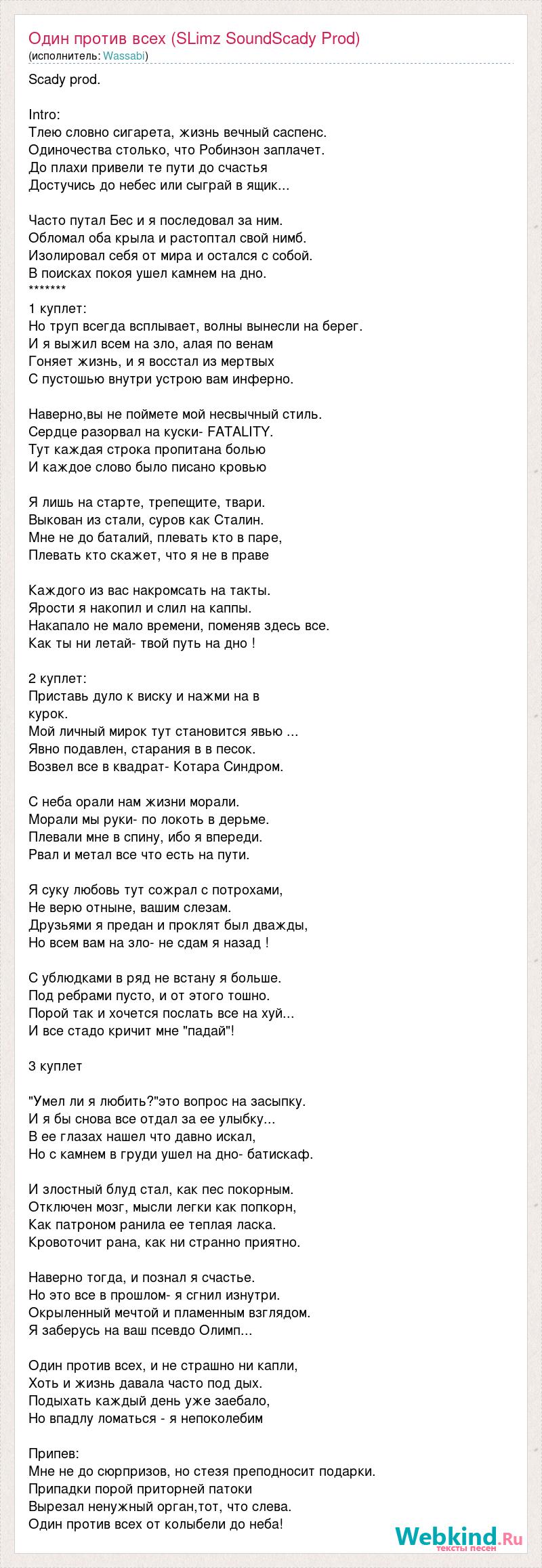 Scady prod. Intro: Тлею словно сигарета, жизнь вечный саспенс. Одиночества столько, что Робинзон заплачет. До плахи привели те пути до счастья Достучись до небес или сыграй в ящик... Часто путал Бес и я последовал за ним. Обломал оба крыла и растоптал свой нимб. Изолировал себя от мира и остался с собой. В поисках покоя ушел камнем на дно. ******* 1 куплет: Но труп всегда всплывает, волны вынесли на берег. И я выжил всем на зло, алая по венам Гоняет жизнь, и я восстал из мертвых С пустошью внутри устрою вам инферно. Наверно,вы не поймете мой несвычный стиль. Сердце разорвал на куски- FATALITY. Тут каждая строка пропитана болью И каждое слово было писано кровью Я лишь на старте, трепещите, твари. Выкован из стали, суров как Сталин. Мне не до баталий, плевать кто в паре, Плевать кто скажет, что я не в праве Каждого из вас накромсать на такты. Ярости я накопил и слил на каппы. Накапало не мало времени, поменяв здесь все. Как ты ни летай- твой путь на дно ! 2 куплет: Приставь дуло к виску и нажми на в курок. Мой личный мирок тут становится явью ... Явно подавлен, старания в в песок. Возвел все в квадрат- Котара Синдром. С неба орали нам жизни морали. Морали мы руки- по локоть в дерьме. Плевали мне в спину, ибо я впереди. Рвал и метал все что есть на пути. Я суку любовь тут сожрал с потрохами, Не верю отныне, вашим слезам. Друзьями я предан и проклят был дважды, Но всем вам на зло- не сдам я назад ! С ублюдками в ряд не встану я больше. Под ребрами пусто, и от этого тошно. Порой так и хочется послать все на хуй... И все стадо кричит мне "падай"! 3 куплет "Умел ли я любить?"это вопрос на засыпку. И я бы снова все отдал за ее улыбку... В ее глазах нашел что давно искал, Но с камнем в груди ушел на дно- батискаф. И злостный блуд стал, как пес покорным. Отключен мозг, мысли легки как попкорн, Как патроном ранила ее теплая ласка. Кровоточит рана, как ни странно приятно. Наверно тогда, и познал я счастье. Но это все в прошлом- я сгнил изнутри. Окрыленный мечтой и пламенным взглядом. Я заберусь на ваш псевдо Олимп... Один против всех, и не страшно ни капли, Хоть и жизнь давала часто под дых. Подыхать каждый день уже заебало, Но впадлу ломаться - я непоколебим Припев: Мне не до сюрпризов, но стезя преподносит подарки. Припадки порой приторней патоки Вырезал ненужный орган,тот, что слева. Один против всех от колыбели до неба!