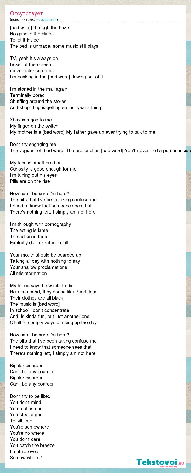 Sunlight coming through the haze No gaps in the blinds To let it inside The bed is unmade, some music still plays TV, yeah it's always on flicker of the screen movie actor screams I'm basking in the [bad word] flowing out of it I'm stoned in the mall again Terminally bored Shuffling around the stores And shoplifting is getting so last year's thing Xbox is a god to me My finger on the switch My mother is a [bad word] My father gave up ever trying to talk to me Don't try engaging me The vaguest of shrugs The prescription drugs You'll never find a person inside My face is smothered on Curiosity is good enough for me I'm tuning out his eyes Pills are on the rise How can I be sure I'm here? The pills that I've been taking confuse me I need to know that someone sees that There's nothing left, I simply am not here I'm through with pornography The acting is lame The action is tame Explicitly dull, or rather a lull Your mouth should be boarded up Talking all day with nothing to say Your shallow proclamations All misinformation My friend says he wants to die He's in a band, they sound like Pearl Jam Their clothes are all black The music is [bad word] In school I don't concentrate And is kinda fun, but just another one Of all the empty ways of using up the day How can I be sure I'm here? The pills that I've been taking confuse me I need to know that someone sees that There's nothing left, I simply am not here Bipolar disorder Can't be any boarder Bipolar disorder Can't be any boarder Don't try to be liked You don't mind You feel no sun You steal a gun To kill time You're somewhere You're no where You don't care You catch the breeze It still relieves So now where?