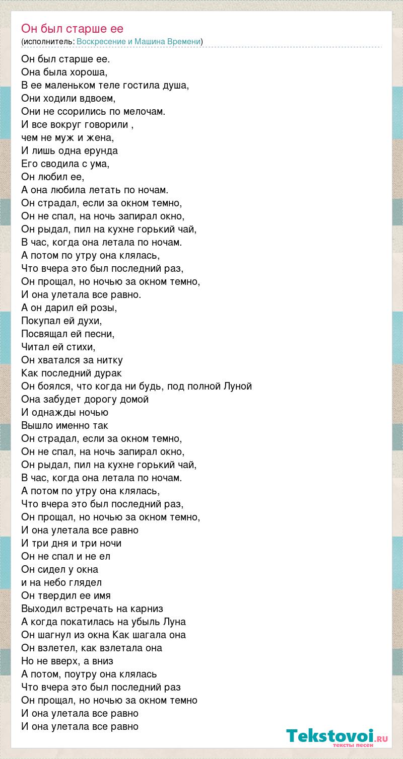 Он был старше ее. Она была хороша, В ее маленьком теле гостила душа, Они ходили вдвоем, Они не ссорились по мелочам. И все вокруг говорили , чем не муж и жена, И лишь одна ерунда Его сводила с ума, Он любил ее, А она любила летать по ночам. Он страдал, если за окном темно, Он не спал, на ночь запирал окно, Он рыдал, пил на кухне горький чай, В час, когда она летала по ночам. А потом по утру она клялась, Что вчера это был последний раз, Он прощал, но ночью за окном темно, И она улетала все равно. А он дарил ей розы, Покупал ей духи, Посвящал ей песни, Читал ей стихи, Он хватался за нитку Как последний дурак Он боялся, что когда ни будь, под полной Луной Она забудет дорогу домой И однажды ночью Вышло именно так Он страдал, если за окном темно, Он не спал, на ночь запирал окно, Он рыдал, пил на кухне горький чай, В час, когда она летала по ночам. А потом по утру она клялась, Что вчера это был последний раз, Он прощал, но ночью за окном темно, И она улетала все равно И три дня и три ночи Он не спал и не ел Он сидел у окна и на небо глядел Он твердил ее имя Выходил встречать на карниз А когда покатилась на убыль Луна Он шагнул из окна Как шагала она Он взлетел, как взлетала она Но не вверх, а вниз А потом, поутру она клялась Что вчера это был последний раз Он прощал, но ночью за окном темно И она улетала все равно И она улетала все равно