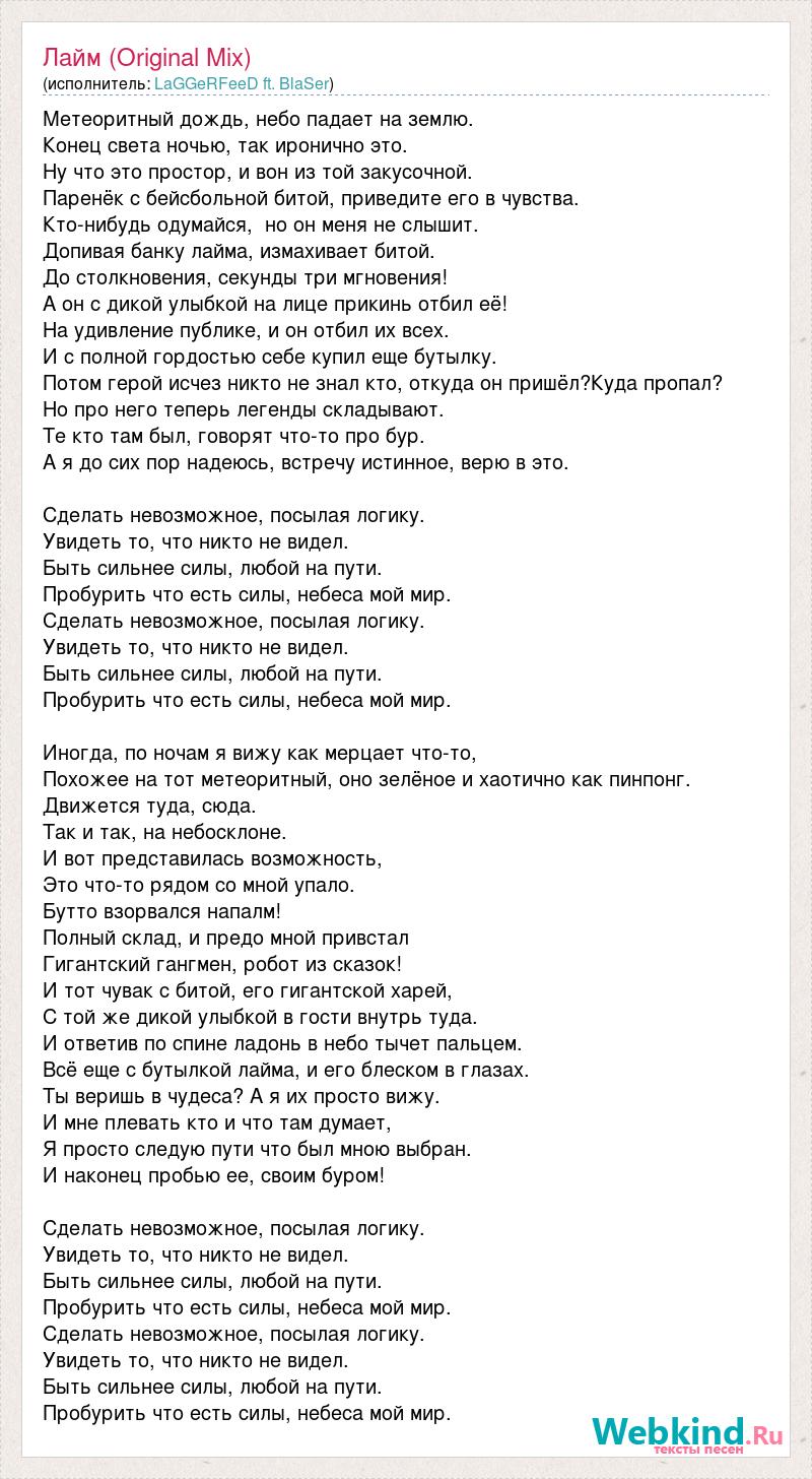 Метеоритный дождь, небо падает на землю. Конец света ночью, так иронично это. Ну что это простор, и вон из той закусочной. Паренёк с бейсбольной битой, приведите его в чувства. Кто-нибудь одумайся, но он меня не слышит. Допивая банку лайма, измахивает битой. До столкновения, секунды три мгновения! А он с дикой улыбкой на лице прикинь отбил её! На удивление публике, и он отбил их всех. И с полной гордостью себе купил еще бутылку. Потом герой исчез никто не знал кто, откуда он пришёл?Куда пропал? Но про него теперь легенды складывают. Те кто там был, говорят что-то про бур. А я до сих пор надеюсь, встречу истинное, верю в это. Сделать невозможное, посылая логику. Увидеть то, что никто не видел. Быть сильнее силы, любой на пути. Пробурить что есть силы, небеса мой мир. Сделать невозможное, посылая логику. Увидеть то, что никто не видел. Быть сильнее силы, любой на пути. Пробурить что есть силы, небеса мой мир. Иногда, по ночам я вижу как мерцает что-то, Похожее на тот метеоритный, оно зелёное и хаотично как пинпонг. Движется туда, сюда. Так и так, на небосклоне. И вот представилась возможность, Это что-то рядом со мной упало. Бутто взорвался напалм! Полный склад, и предо мной привстал Гигантский гангмен, робот из сказок! И тот чувак с битой, его гигантской харей, С той же дикой улыбкой в гости внутрь туда. И ответив по спине ладонь в небо тычет пальцем. Всё еще с бутылкой лайма, и его блеском в глазах. Ты веришь в чудеса? А я их просто вижу. И мне плевать кто и что там думает, Я просто следую пути что был мною выбран. И наконец пробью ее, своим буром! Сделать невозможное, посылая логику. Увидеть то, что никто не видел. Быть сильнее силы, любой на пути. Пробурить что есть силы, небеса мой мир. Сделать невозможное, посылая логику. Увидеть то, что никто не видел. Быть сильнее силы, любой на пути. Пробурить что есть силы, небеса мой мир.