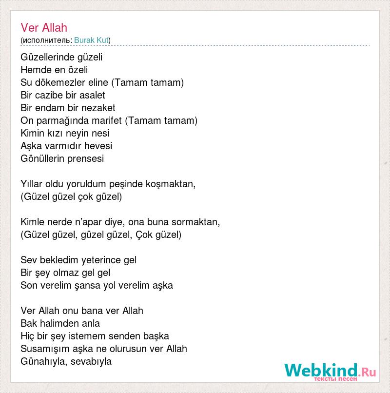 Güzellerinde güzeli Hemde en özeli Su dökemezler eline (Tamam tamam) Bir cazibe bir asalet Bir endam bir nezaket On parmağında marifet (Tamam tamam) Kimin kızı neyin nesi Aşka varmıdır hevesi Gönüllerin prensesi Yıllar oldu yoruldum peşinde koşmaktan, (Güzel güzel çok güzel) Kimle nerde n’apar diye, ona buna sormaktan, (Güzel güzel, güzel güzel, Çok güzel) Sev bekledim yeterince gel Bir şey olmaz gel gel Son verelim şansa yol verelim aşka Ver Allah onu bana ver Allah Bak halimden anla Hiç bir şey istemem senden başka Susamışım aşka ne olurusun ver Allah Günahıyla, sevabıyla