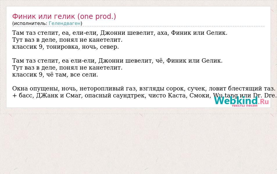 Там таз стелит, еа, ели-ели, Джонни шевелит, аха, Финик или Gелик. Тут ваз в деле, понял не канетелит. классик 9, тонировка, ночь, север. Там таз стелит, еа ели-ели, Джонни шевелит, чё, Финик или Gелик. Тут ваз в деле, понял не канетелит. классик 9, чё там, все сели. Окна опущены, ночь, неторопливый газ, взгляды сорок, сучек, ловит блестящий таз. + басс, ДЖанк и Смаr, опасный саундтрек, чисто Каста, Смоки, Wu tang или Dr. Dre.