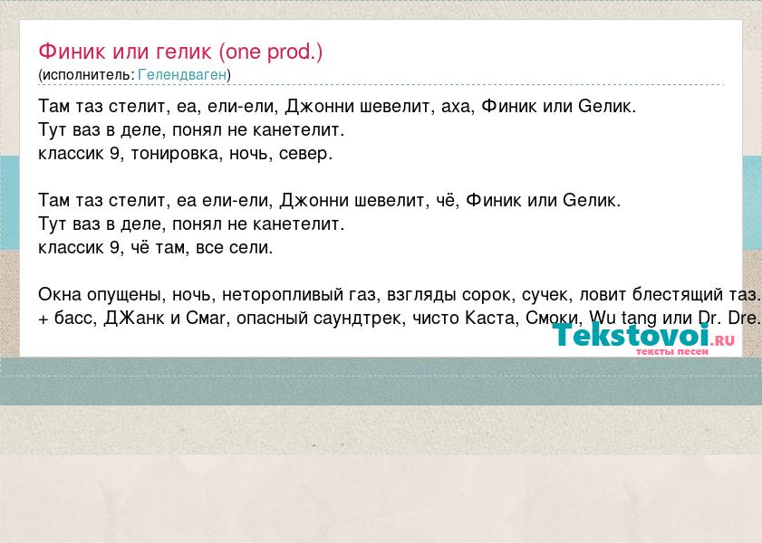 Там таз стелит, еа, ели-ели, Джонни шевелит, аха, Финик или Gелик. Тут ваз в деле, понял не канетелит. классик 9, тонировка, ночь, север. Там таз стелит, еа ели-ели, Джонни шевелит, чё, Финик или Gелик. Тут ваз в деле, понял не канетелит. классик 9, чё там, все сели. Окна опущены, ночь, неторопливый газ, взгляды сорок, сучек, ловит блестящий таз. + басс, ДЖанк и Смаr, опасный саундтрек, чисто Каста, Смоки, Wu tang или Dr. Dre.