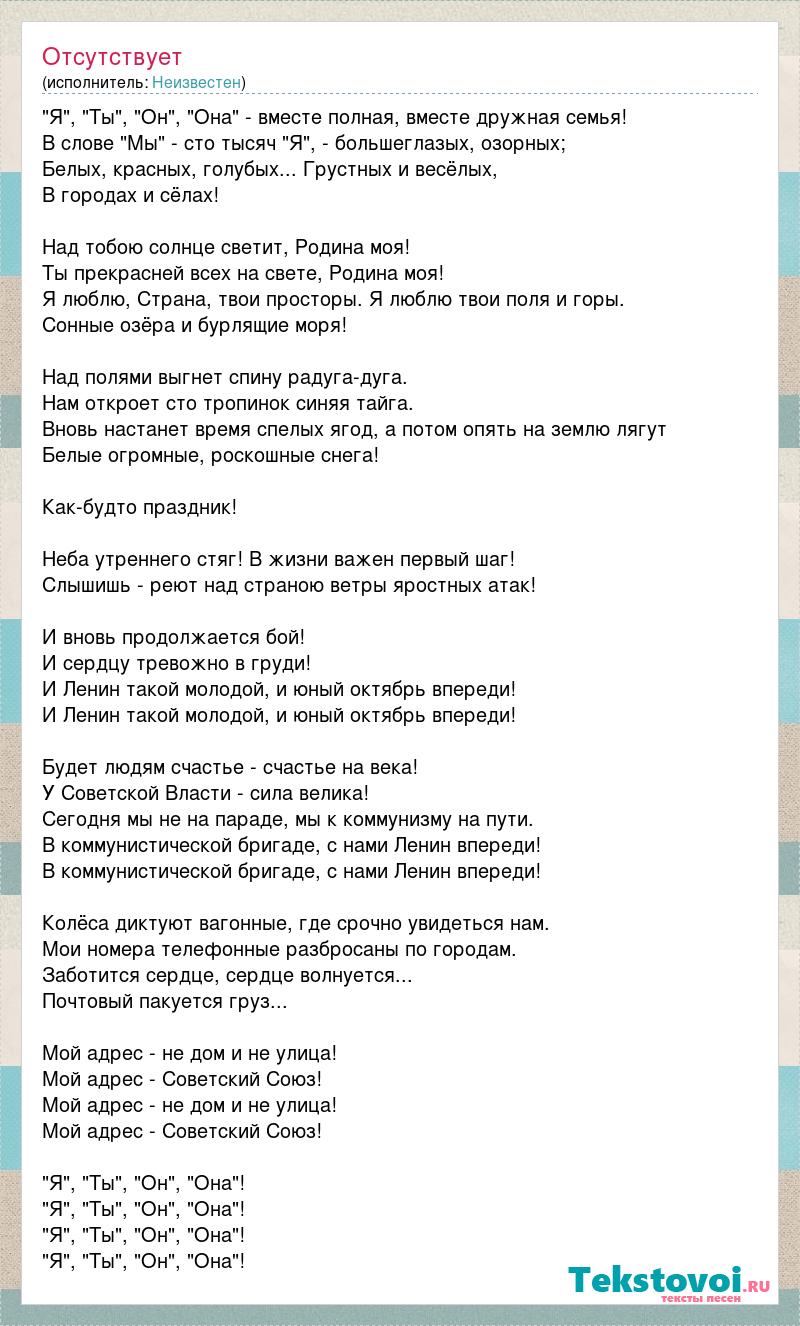 "Я", "Ты", "Он", "Она" - вместе полная, вместе дружная семья! В слове "Мы" - сто тысяч "Я", - большеглазых, озорных; Белых, красных, голубых... Грустных и весёлых, В городах и сёлах! Над тобою солнце светит, Родина моя! Ты прекрасней всех на свете, Родина моя! Я люблю, Страна, твои просторы. Я люблю твои поля и горы. Сонные озёра и бурлящие моря! Над полями выгнет спину радуга-дуга. Нам откроет сто тропинок синяя тайга. Вновь настанет время спелых ягод, а потом опять на землю лягут Белые огромные, роскошные снега! Как-будто праздник! Неба утреннего стяг! В жизни важен первый шаг! Слышишь - реют над страною ветры яростных атак! И вновь продолжается бой! И сердцу тревожно в груди! И Ленин такой молодой, и юный октябрь впереди! И Ленин такой молодой, и юный октябрь впереди! Будет людям счастье - счастье на века! У Советской Власти - сила велика! Сегодня мы не на параде, мы к коммунизму на пути. В коммунистической бригаде, с нами Ленин впереди! В коммунистической бригаде, с нами Ленин впереди! Колёса диктуют вагонные, где срочно увидеться нам. Мои номера телефонные разбросаны по городам. Заботится сердце, сердце волнуется... Почтовый пакуется груз... Мой адрес - не дом и не улица! Мой адрес - Советский Союз! Мой адрес - не дом и не улица! Мой адрес - Советский Союз! "Я", "Ты", "Он", "Она"! "Я", "Ты", "Он", "Она"! "Я", "Ты", "Он", "Она"! "Я", "Ты", "Он", "Она"!