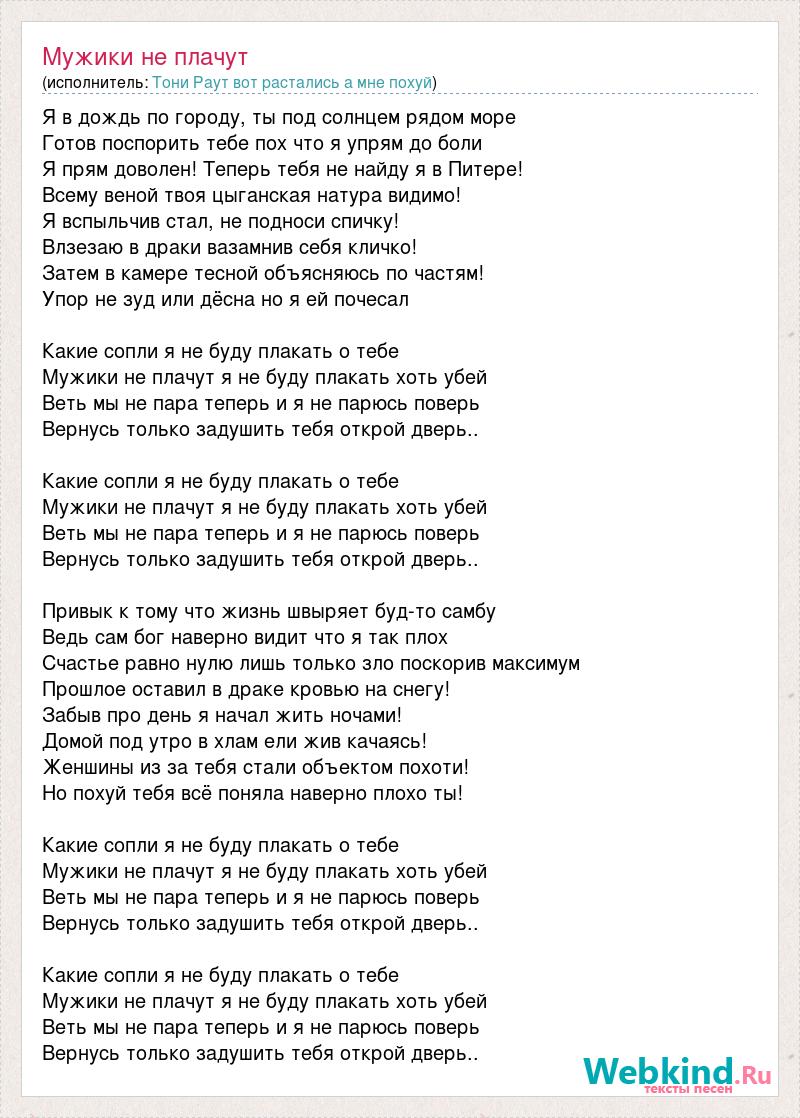 Я в дождь по городу, ты под солнцем рядом море Готов поспорить тебе пох что я упрям до боли Я прям доволен! Теперь тебя не найду я в Питере! Всему веной твоя цыганская натура видимо! Я вспыльчив стал, не подноси спичку! Влзезаю в драки вазамнив себя кличко! Затем в камере тесной объясняюсь по частям! Упор не зуд или дёсна но я ей почесал Какие сопли я не буду плакать о тебе Мужики не плачут я не буду плакать хоть убей Веть мы не пара теперь и я не парюсь поверь Вернусь только задушить тебя открой дверь.. Какие сопли я не буду плакать о тебе Мужики не плачут я не буду плакать хоть убей Веть мы не пара теперь и я не парюсь поверь Вернусь только задушить тебя открой дверь.. Привык к тому что жизнь швыряет буд-то самбу Ведь сам бог наверно видит что я так плох Счастье равно нулю лишь только зло поскорив максимум Прошлое оставил в драке кровью на снегу! Забыв про день я начал жить ночами! Домой под утро в хлам ели жив качаясь! Женшины из за тебя стали объектом похоти! Но похуй тебя всё поняла наверно плохо ты! Какие сопли я не буду плакать о тебе Мужики не плачут я не буду плакать хоть убей Веть мы не пара теперь и я не парюсь поверь Вернусь только задушить тебя открой дверь.. Какие сопли я не буду плакать о тебе Мужики не плачут я не буду плакать хоть убей Веть мы не пара теперь и я не парюсь поверь Вернусь только задушить тебя открой дверь..