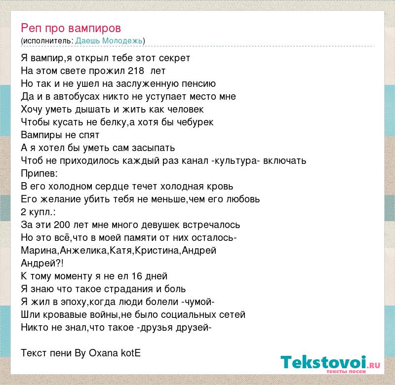 Я вампир,я открыл тебе этот секрет На этом свете прожил 218 лет Но так и не ушел на заслуженную пенсию Да и в автобусах никто не уступает место мне Хочу уметь дышать и жить как человек Чтобы кусать не белку,а хотя бы чебурек Вампиры не спят А я хотел бы уметь сам засыпать Чтоб не приходилось каждый раз канал -культура- включать Припев: В его холодном сердце течет холодная кровь Его желание убить тебя не меньше,чем его любовь 2 купл.: За эти 200 лет мне много девушек встречалось Но это всё,что в моей памяти от них осталось- Марина,Анжелика,Катя,Кристина,Андрей Андрей?! К тому моменту я не ел 16 дней Я знаю что такое страдания и боль Я жил в эпоху,когда люди болели -чумой- Шли кровавые войны,не было социальных сетей Никто не знал,что такое -друзья друзей- Текст пени By Oxana kotE