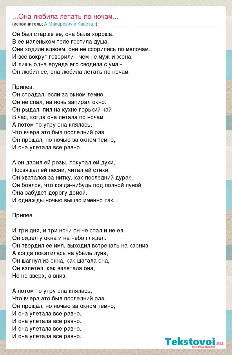 Он был старше ее, она была хороша. В ее маленьком теле гостила душа. Они ходили вдвоем, они не ссорились по мелочам. И все вокруг говорили - чем не муж и жена. И лишь одна ерунда его сводила с ума - Он любил ее, она любила летать по ночам. Припев: Он страдал, если за окном темно. Он не спал, на ночь запирал окно. Он рыдал, пил на кухне горький чай В час, когда она летала по ночам. А потом по утру она клялась, Что вчера это был последний раз. Он прощал, но ночью за окном темно, И она улетала все равно. А он дарил ей розы, покупал ей духи, Посвящал ей песни, читал ей стихи, Он хватался за нитку, как последний дурак. Он боялся, что когда-нибудь под полной луной Она забудет дорогу домой. И однажды ночью вышло именно так... Припев. И три дня, и три ночи он не спал и не ел. Он сидел у окна и на небо глядел. Он твердил ее имя, выходил встречать на карниз. А когда покатилась на убыль луна, Он шагнул из окна, как шагала она, Он взлетел, как взлетала она, Но не вверх, а вниз. А потом по утру она клялась, Что вчера это был последний раз. Он прощал, но ночью за окном темно, И она улетала все равно. И она улетала все равно. И она улетала все равно. И она улетала все равно.