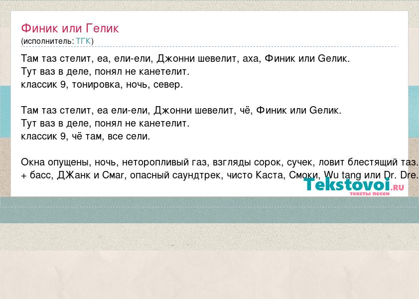 Там таз стелит, еа, ели-ели, Джонни шевелит, аха, Финик или Gелик. Тут ваз в деле, понял не канетелит. классик 9, тонировка, ночь, север. Там таз стелит, еа ели-ели, Джонни шевелит, чё, Финик или Gелик. Тут ваз в деле, понял не канетелит. классик 9, чё там, все сели. Окна опущены, ночь, неторопливый газ, взгляды сорок, сучек, ловит блестящий таз. + басс, ДЖанк и Смаr, опасный саундтрек, чисто Каста, Смоки, Wu tang или Dr. Dre.