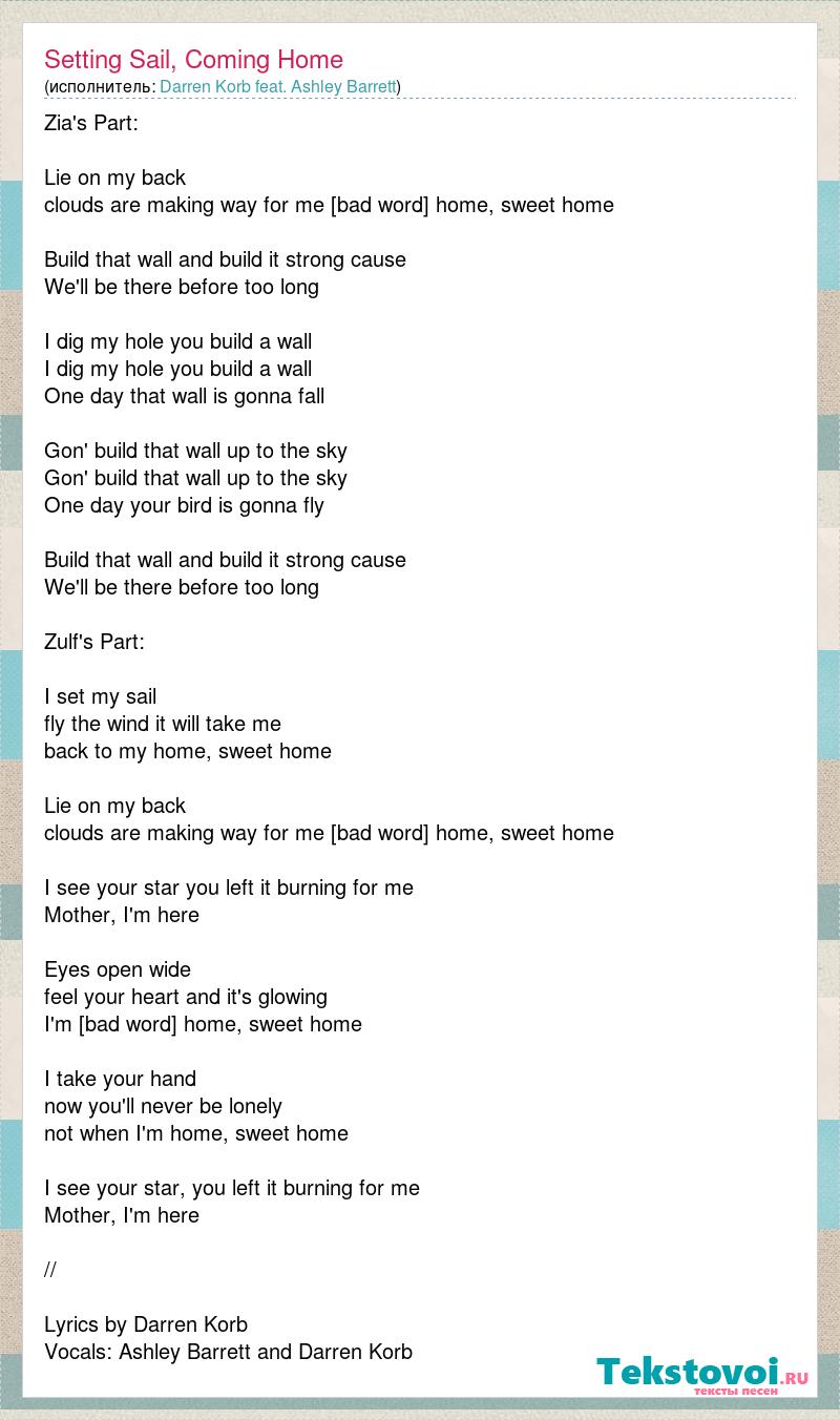 Zia's Part: Lie on my back clouds are making way for me I'm coming home, sweet home Build that wall and build it strong cause We'll be there before too long I dig my hole you build a wall I dig my hole you build a wall One day that wall is gonna fall Gon' build that wall up to the sky Gon' build that wall up to the sky One day your bird is gonna fly Build that wall and build it strong cause We'll be there before too long Zulf's Part: I set my sail fly the wind it will take me back to my home, sweet home Lie on my back clouds are making way for me I'm coming home, sweet home I see your star you left it burning for me Mother, I'm here Eyes open wide feel your heart and it's glowing I'm welcome home, sweet home I take your hand now you'll never be lonely not when I'm home, sweet home I see your star, you left it burning for me Mother, I'm here // Lyrics by Darren Korb Vocals: Ashley Barrett and Darren Korb