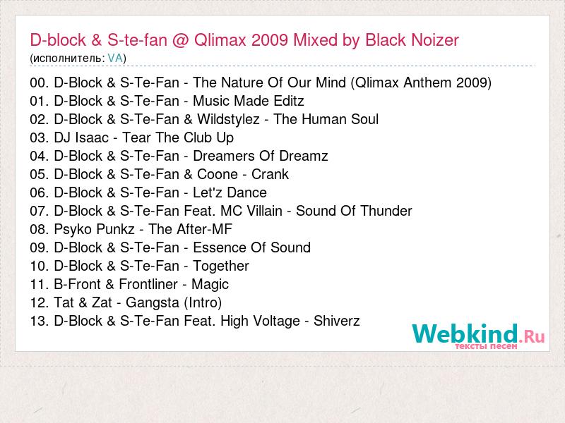 00. D-Block & S-Te-Fan - The Nature Of Our Mind (Qlimax Anthem 2009) 01. D-Block & S-Te-Fan - Music Made Editz 02. D-Block & S-Te-Fan & Wildstylez - The Human Soul 03. DJ Isaac - Tear The Club Up 04. D-Block & S-Te-Fan - Dreamers Of Dreamz 05. D-Block & S-Te-Fan & Coone - Crank 06. D-Block & S-Te-Fan - Let'z Dance 07. D-Block & S-Te-Fan Feat. MC Villain - Sound Of Thunder 08. Psyko Punkz - The After-MF 09. D-Block & S-Te-Fan - Essence Of Sound 10. D-Block & S-Te-Fan - Together 11. B-Front & Frontliner - Magic 12. Tat & Zat - Gangsta (Intro) 13. D-Block & S-Te-Fan Feat. High Voltage - Shiverz
