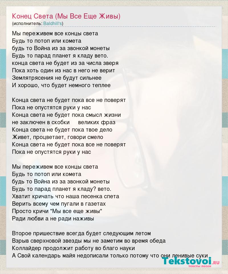 Мы переживем все концы света Будь то потоп или комета будь то Война из за звонкой монеты Будь то парад планет я кладу вето. конца света не будет из за числа зверя Пока хоть один из нас в него не верит Землятрясения не будут сильнее И хорошо, что будет немного теплее Конца света не будет пока все не поверят Пока не опустятся руки у нас Конца света не будет пока смысл жизни не заключен в скобки великих фраз Конца света не будет пока твое дело Живет, процветает, говори смело Конца света не будет пока все не поверят Пока не опустятся руки у нас Мы переживем все концы света Будь то потоп или комета будь то Война из за звонкой монеты Будь то парад планет я кладу? вето. Хватит кричать что наша песенка спета Верить всему чем пугали в газетах Просто кричи "Мы все еще живы" Ради любви а не ради наживы Второе пришествие всегда будет следующим летом Взрыв сверхновой звезды мы не заметим во время обеда Коллайдер продолжит работу во благо науки А Свой календарь майя недописали только потому что они ленивые суки