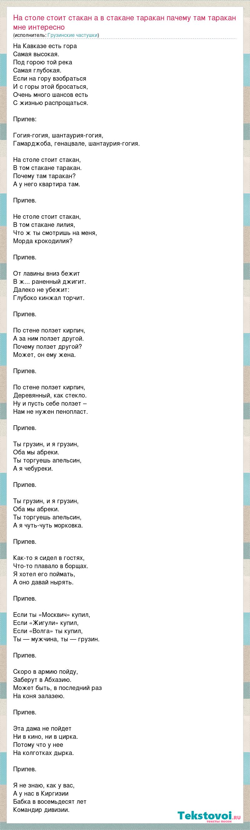 Главная→Исполнители→Грузинские частушки→На столе стоит стакан а в стакане таракан пачему там таракан мне интересно