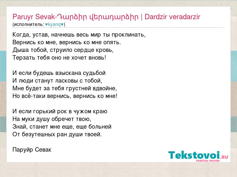 Когда, устав, начнешь весь мир ты проклинать, Вернись ко мне, вернись ко мне опять. Дыша тобой, струило сердце кровь, Терзать тебя оно не хочет вновь! И если будешь взыскана судьбой И люди станут ласковы с тобой, Мне будет за тебя грустней вдвойне, Но всё-таки вернись, вернись ко мне! И если горький рок в чужом краю На муки душу обречет твою, Знай, станет мне еще, еще больней От безутешных ран души твоей. Паруйр Севак