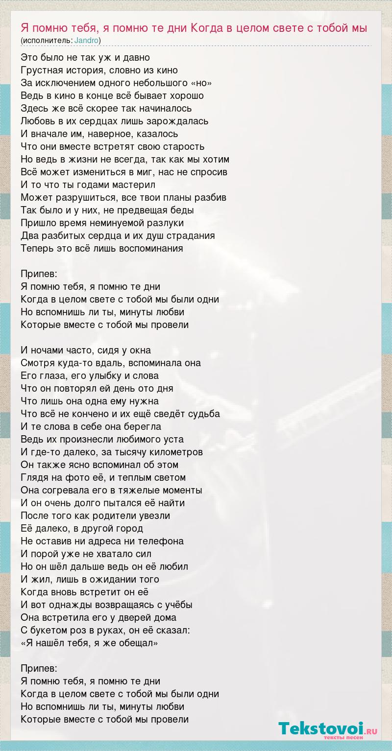 Это было не так уж и давно Грустная история, словно из кино За исключением одного небольшого «но» Ведь в кино в конце всё бывает хорошо Здесь же всё скорее так начиналось Любовь в их сердцах лишь зарождалась И вначале им, наверное, казалось Что они вместе встретят свою старость Но ведь в жизни не всегда, так как мы хотим Всё может измениться в миг, нас не спросив И то что ты годами мастерил Может разрушиться, все твои планы разбив Так было и у них, не предвещая беды Пришло время неминуемой разлуки Два разбитых сердца и их душ страдания Теперь это всё лишь воспоминания Припев: Я помню тебя, я помню те дни Когда в целом свете с тобой мы были одни Но вспомнишь ли ты, минуты любви Которые вместе с тобой мы провели И ночами часто, сидя у окна Смотря куда-то вдаль, вспоминала она Его глаза, его улыбку и слова Что он повторял ей день ото дня Что лишь она одна ему нужна Что всё не кончено и их ещё сведёт судьба И те слова в себе она берегла Ведь их произнесли любимого уста И где-то далеко, за тысячу километров Он также ясно вспоминал об этом Глядя на фото её, и теплым светом Она согревала его в тяжелые моменты И он очень долго пытался её найти После того как родители увезли Её далеко, в другой город Не оставив ни адреса ни телефона И порой уже не хватало сил Но он шёл дальше ведь он её любил И жил, лишь в ожидании того Когда вновь встретит он её И вот однажды возвращаясь с учёбы Она встретила его у дверей дома С букетом роз в руках, он её сказал: «Я нашёл тебя, я же обещал» Припев: Я помню тебя, я помню те дни Когда в целом свете с тобой мы были одни Но вспомнишь ли ты, минуты любви Которые вместе с тобой мы провели