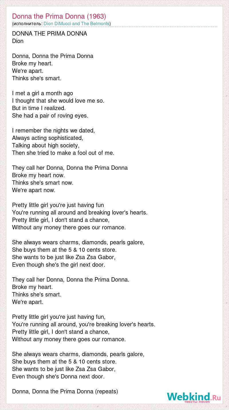 DONNA THE PRIMA DONNA Dion Donna, Donna the Prima Donna Broke my heart. We're apart. Thinks she's smart. I met a girl a month ago I thought that she would love me so. But in time I realized. She had a pair of roving eyes. I remember the nights we dated, Always acting sophisticated, Talking about high society, Then she tried to make a fool out of me. They call her Donna, Donna the Prima Donna Broke my heart now. Thinks she's smart now. We're apart now. Pretty little girl you're just having fun You're running all around and breaking lover's hearts. Pretty little girl, I don't stand a chance, Without any money there goes our romance. She always wears charms, diamonds, pearls galore, She buys them at the 5 & 10 cents store. She wants to be just like Zsa Zsa Gabor, Even though she's the girl next door. They call her Donna, Donna the Prima Donna. Broke my heart. Thinks she's smart. We're apart. Pretty little girl you're just having fun, You're running all around, you're breaking lover's hearts. Pretty little girl, I don't stand a chance, Without any money there goes our romance. She always wears charms, diamonds, pearls galore, She buys them at the 5 & 10 cents store. She wants to be just like Zsa Zsa Gabor, Even though she's Donna next door. Donna, Donna the Prima Donna (repeats)