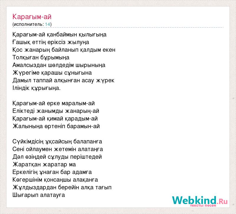 Қарағым-ай қанбаймын қылығыңа Ғашық еттің еріксіз жылуңа Қос жанарың байланып қалдым екен Толқыған бұрымыңа Амалсыздан шөлдедім шырыныңа Жүрегіме қарашы сұнығына Дамыл таппай алқынған асау жүрек Іліндік құрығыңа. Қарағым-ай ерке маралым-ай Еліктеді жанымды жанарың-ай Қарағым-ай қимай қарадым-ай Жалыныңа өртеніп барамын-ай Сүйкімдісің ұқсайсың балапанға Сені ойлаумен жетемін алатаңға Дәл өзіңдей сұлуды періштедей Жаратқан жаратар ма Еркелігің ұнаған бар адамға Көгершінім қонсаңшы алақанға Жұлдыздардан берейін алқа тағып Шығарып алатауға