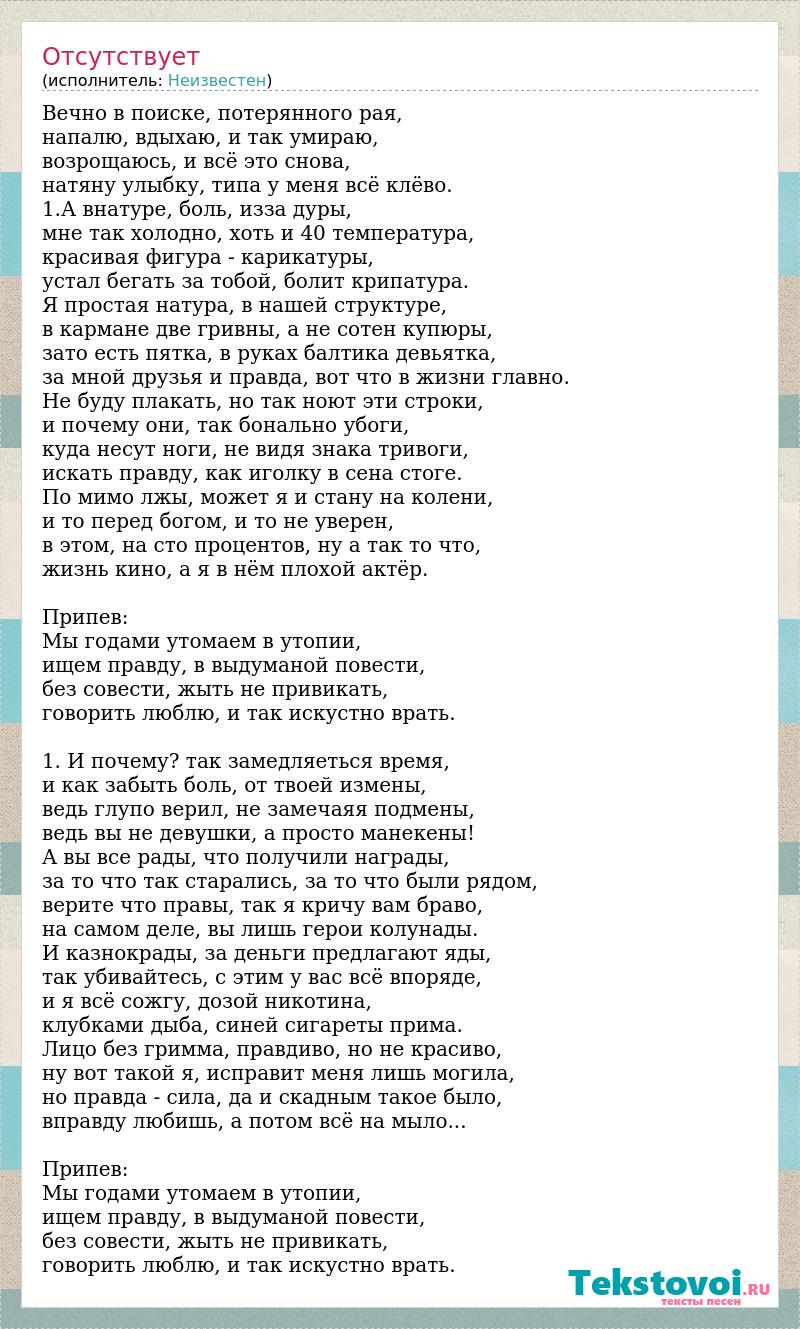 Вечно в поиске, потерянного рая, напалю, вдыхаю, и так умираю, возрощаюсь, и всё это снова, натяну улыбку, типа у меня всё клёво. 1.А внатуре, боль, изза дуры, мне так холодно, хоть и 40 температура, красивая фигура - карикатуры, устал бегать за тобой, болит крипатура. Я простая натура, в нашей структуре, в кармане две гривны, а не сотен купюры, зато есть пятка, в руках балтика девьятка, за мной друзья и правда, вот что в жизни главно. Не буду плакать, но так ноют эти строки, и почему они, так бонально убоги, куда несут ноги, не видя знака тривоги, искать правду, как иголку в сена стоге. По мимо лжы, может я и стану на колени, и то перед богом, и то не уверен, в этом, на сто процентов, ну а так то что, жизнь кино, а я в нём плохой актёр. Припев: Мы годами утомаем в утопии, ищем правду, в выдуманой повести, без совести, жыть не привикать, говорить люблю, и так искустно врать. 1. И почему? так замедляеться время, и как забыть боль, от твоей измены, ведь глупо верил, не замечаяя подмены, ведь вы не девушки, а просто манекены! А вы все рады, что получили награды, за то что так старались, за то что были рядом, верите что правы, так я кричу вам браво, на самом деле, вы лишь герои колунады. И казнокрады, за деньги предлагают яды, так убивайтесь, с этим у вас всё впоряде, и я всё сожгу, дозой никотина, клубками дыба, синей сигареты прима. Лицо без гримма, правдиво, но не красиво, ну вот такой я, исправит меня лишь могила, но правда - сила, да и скадным такое было, вправду любишь, а потом всё на мыло... Припев: Мы годами утомаем в утопии, ищем правду, в выдуманой повести, без совести, жыть не привикать, говорить люблю, и так искустно врать.