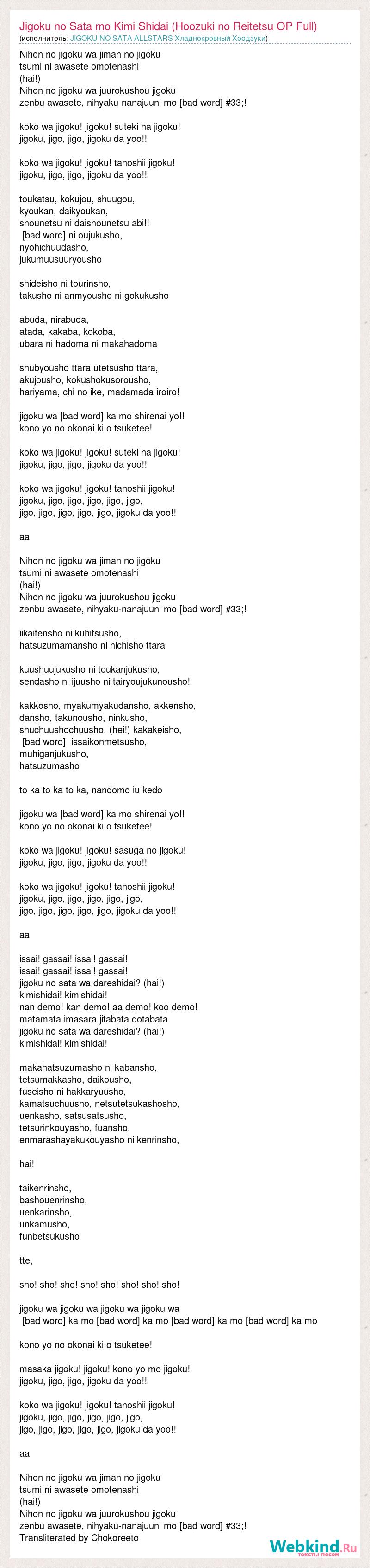 Nihon no jigoku wa jiman no jigoku tsumi ni awasete omotenashi (hai!) Nihon no jigoku wa juurokushou jigoku zenbu awasete, nihyaku-nanajuuni mo [bad word] #33;! koko wa jigoku! jigoku! suteki na jigoku! jigoku, jigo, jigo, jigoku da yoo!! koko wa jigoku! jigoku! tanoshii jigoku! jigoku, jigo, jigo, jigoku da yoo!! toukatsu, kokujou, shuugou, kyoukan, daikyoukan, shounetsu ni daishounetsu abi!! [bad word] ni oujukusho, nyohichuudasho, jukumuusuuryousho shideisho ni tourinsho, takusho ni anmyousho ni gokukusho abuda, nirabuda, atada, kakaba, kokoba, ubara ni hadoma ni makahadoma shubyousho ttara utetsusho ttara, akujousho, kokushokusorousho, hariyama, chi no ike, madamada iroiro! jigoku wa [bad word] ka mo shirenai yo!! kono yo no okonai ki o tsuketee! koko wa jigoku! jigoku! suteki na jigoku! jigoku, jigo, jigo, jigoku da yoo!! koko wa jigoku! jigoku! tanoshii jigoku! jigoku, jigo, jigo, jigo, jigo, jigo, jigo, jigo, jigo, jigo, jigo, jigoku da yoo!! aa Nihon no jigoku wa jiman no jigoku tsumi ni awasete omotenashi (hai!) Nihon no jigoku wa juurokushou jigoku zenbu awasete, nihyaku-nanajuuni mo [bad word] #33;! iikaitensho ni kuhitsusho, hatsuzumamansho ni hichisho ttara kuushuujukusho ni toukanjukusho, sendasho ni ijuusho ni tairyoujukunousho! kakkosho, myakumyakudansho, akkensho, dansho, takunousho, ninkusho, shuchuushochuusho, (hei!) kakakeisho, [bad word] issaikonmetsusho, muhiganjukusho, hatsuzumasho to ka to ka to ka, nandomo iu kedo jigoku wa [bad word] ka mo shirenai yo!! kono yo no okonai ki o tsuketee! koko wa jigoku! jigoku! sasuga no jigoku! jigoku, jigo, jigo, jigoku da yoo!! koko wa jigoku! jigoku! tanoshii jigoku! jigoku, jigo, jigo, jigo, jigo, jigo, jigo, jigo, jigo, jigo, jigo, jigoku da yoo!! aa issai! gassai! issai! gassai! issai! gassai! issai! gassai! jigoku no sata wa dareshidai? (hai!) kimishidai! kimishidai! nan demo! kan demo! aa demo! koo demo! matamata imasara jitabata dotabata jigoku no sata wa dareshidai? (hai!) kimishidai! kimishidai! makahatsuzumasho ni kabansho, tetsumakkasho, daikousho, fuseisho ni hakkaryuusho, kamatsuchuusho, netsutetsukashosho, uenkasho, satsusatsusho, tetsurinkouyasho, fuansho, enmarashayakukouyasho ni kenrinsho, hai! taikenrinsho, bashouenrinsho, uenkarinsho, unkamusho, funbetsukusho tte, sho! sho! sho! sho! sho! sho! sho! sho! jigoku wa jigoku wa jigoku wa jigoku wa [bad word] ka mo [bad word] ka mo [bad word] ka mo [bad word] ka mo kono yo no okonai ki o tsuketee! masaka jigoku! jigoku! kono yo mo jigoku! jigoku, jigo, jigo, jigoku da yoo!! koko wa jigoku! jigoku! tanoshii jigoku! jigoku, jigo, jigo, jigo, jigo, jigo, jigo, jigo, jigo, jigo, jigo, jigoku da yoo!! aa Nihon no jigoku wa jiman no jigoku tsumi ni awasete omotenashi (hai!) Nihon no jigoku wa juurokushou jigoku zenbu awasete, nihyaku-nanajuuni mo [bad word] #33;! Transliterated by Chokoreeto