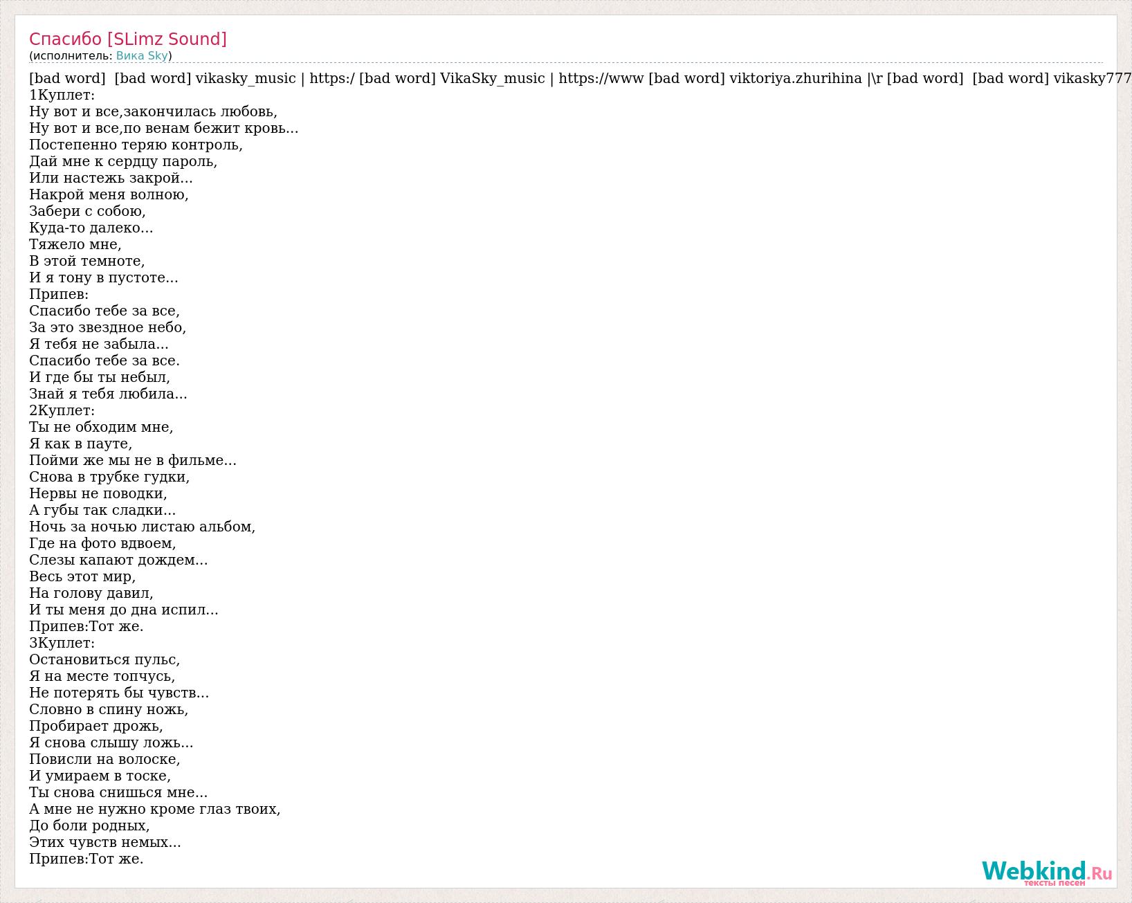 [bad word] [bad word] vikasky_music | https:/ [bad word] VikaSky_music | https://www [bad word] viktoriya.zhurihina |\r [bad word] [bad word] vikasky777 1Куплет: Ну вот и все,закончилась любовь, Ну вот и все,по венам бежит кровь... Постепенно теряю контроль, Дай мне к сердцу пароль, Или настежь закрой... Накрой меня волною, Забери с собою, Куда-то далеко... Тяжело мне, В этой темноте, И я тону в пустоте... Припев: Спасибо тебе за все, За это звездное небо, Я тебя не забыла... Спасибо тебе за все. И где бы ты небыл, Знай я тебя любила... 2Куплет: Ты не обходим мне, Я как в пауте, Пойми же мы не в фильме... Снова в трубке гудки, Нервы не поводки, А губы так сладки... Ночь за ночью листаю альбом, Где на фото вдвоем, Слезы капают дождем... Весь этот мир, На голову давил, И ты меня до дна испил... Припев:Тот же. 3Куплет: Остановиться пульс, Я на месте топчусь, Не потерять бы чувств... Словно в спину ножь, Пробирает дрожь, Я снова слышу ложь... Повисли на волоске, И умираем в тоске, Ты снова снишься мне... А мне не нужно кроме глаз твоих, До боли родных, Этих чувств немых... Припев:Тот же.