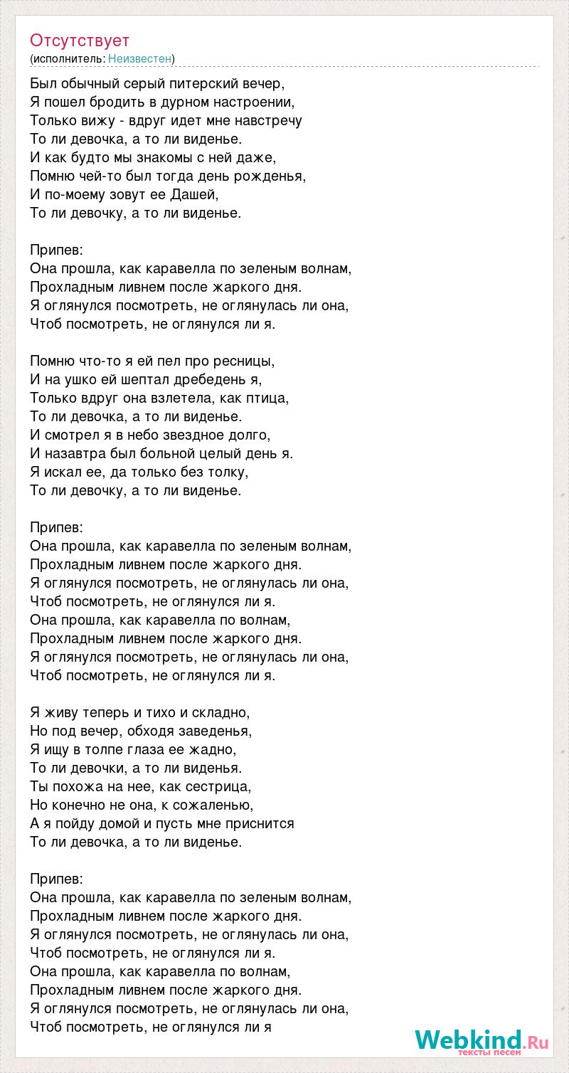 Был обычный серый питерский вечер, Я пошел бродить в дурном настроении, Только вижу - вдруг идет мне навстречу То ли девочка, а то ли виденье. И как будто мы знакомы с ней даже, Помню чей-то был тогда день рожденья, И по-моему зовут ее Дашей, То ли девочку, а то ли виденье. Припев: Она прошла, как каравелла по зеленым волнам, Прохладным ливнем после жаркого дня. Я оглянулся посмотреть, не оглянулась ли она, Чтоб посмотреть, не оглянулся ли я. Помню что-то я ей пел про ресницы, И на ушко ей шептал дребедень я, Только вдруг она взлетела, как птица, То ли девочка, а то ли виденье. И смотрел я в небо звездное долго, И назавтра был больной целый день я. Я искал ее, да только без толку, То ли девочку, а то ли виденье. Припев: Она прошла, как каравелла по зеленым волнам, Прохладным ливнем после жаркого дня. Я оглянулся посмотреть, не оглянулась ли она, Чтоб посмотреть, не оглянулся ли я. Она прошла, как каравелла по волнам, Прохладным ливнем после жаркого дня. Я оглянулся посмотреть, не оглянулась ли она, Чтоб посмотреть, не оглянулся ли я. Я живу теперь и тихо и складно, Но под вечер, обходя заведенья, Я ищу в толпе глаза ее жадно, То ли девочки, а то ли виденья. Ты похожа на нее, как сестрица, Но конечно не она, к сожаленью, А я пойду домой и пусть мне приснится То ли девочка, а то ли виденье. Припев: Она прошла, как каравелла по зеленым волнам, Прохладным ливнем после жаркого дня. Я оглянулся посмотреть, не оглянулась ли она, Чтоб посмотреть, не оглянулся ли я. Она прошла, как каравелла по волнам, Прохладным ливнем после жаркого дня. Я оглянулся посмотреть, не оглянулась ли она, Чтоб посмотреть, не оглянулся ли я