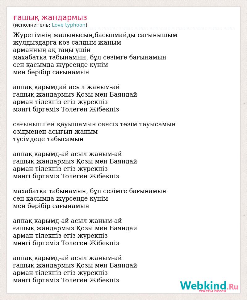 Журегімнің жалынысың,басылмайды сагынышым жулдыздарға көз салдым жаным арманның ақ таңы үшін махабатқа табынамын, бұл сезімге бағынамын сен қасымда жүрсеңде күнім мен бәрібір сағынамын аппақ қарымдай асыл жаным-ай ғашық жандармыз Қозы мен Баяндай арман тілекпіз егіз жүрекпіз мәңгі біргеміз Толеген Жібекпіз сағынышпен қауышамын сенсіз төзім тауысамын өзіңменен асығып жаным түсімдеде табысамын аппақ қарымд-ай асыл жаным-ай ғашық жандармыз Қозы мен Баяндай арман тілекпіз егіз жүрекпіз мәңгі біргеміз Толеген Жібекпіз махабатқа табынамын, бұл сезімге бағынамын сен қасымда жүрсеңде күнім мен бәрібір сағынамын аппақ қарымд-ай асыл жаным-ай ғашық жандармыз Қозы мен Баяндай арман тілекпіз егіз жүрекпіз мәңгі біргеміз Толеген Жібекпіз аппақ қарымд-ай асыл жаным-ай ғашық жандармыз Қозы мен Баяндай арман тілекпіз егіз жүрекпіз мәңгі біргеміз Толеген Жібекпіз