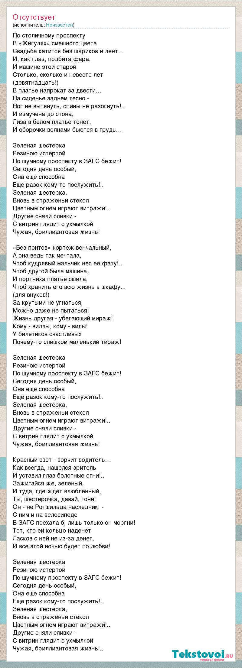 По столичному проспекту В «Жигулях» смешного цвета Свадьба катится без шариков и лент… И, как глаз, подбита фара, И машине этой старой Cтолько, сколько и невесте лет (девятнадцать!) В платье напрокат за двести… На сиденье заднем тесно - Ног не вытянуть, спины не разогнуть!.. И измучена до стона, Лиза в белом платье тонет, И оборочки волнами бьются в грудь… Зеленая шестерка Резиною истертой По шумному проспекту в ЗАГС бежит! Сегодня день особый, Она еще способна Еще разок кому-то послужить!.. Зеленая шестерка, Вновь в отраженьи стекол Цветным огнем играют витражи!.. Другие сняли сливки - С витрин глядит с ухмылкой Чужая, бриллиантовая жизнь! «Без понтов» кортеж венчальный, А она ведь так мечтала, Чтоб кудрявый мальчик нес ее фату!.. Чтоб другой была машина, И портниха платье сшила, Чтоб хранить его всю жизнь в шкафу... (для внуков!) За крутыми не угнаться, Можно даже не пытаться! Жизнь другая - убегающий мираж! Кому - виллы, кому - вилы! У билетиков счастливых Почему-то слишком маленький тираж! Зеленая шестерка Резиною истертой По шумному проспекту в ЗАГС бежит! Сегодня день особый, Она еще способна Еще разок кому-то послужить!.. Зеленая шестерка, Вновь в отраженьи стекол Цветным огнем играют витражи!.. Другие сняли сливки - С витрин глядит с ухмылкой Чужая, бриллиантовая жизнь! Красный свет - ворчит водитель… Как всегда, нашелся зритель И уставил глаз болотные огни!.. Зажигайся же, зеленый, И туда, где ждет влюбленный, Ты, шестерочка, давай, гони! Он - не Ротшильда наследник, - С ним и на велосипеде В ЗАГС поехала б, лишь только он моргни! Тот, кто ей кольцо наденет Ласков с ней не из-за денег, И все этой ночью будет по любви! Зеленая шестерка Резиною истертой По шумному проспекту в ЗАГС бежит! Сегодня день особый, Она еще способна Еще разок кому-то послужить!.. Зеленая шестерка, Вновь в отраженьи стекол Цветным огнем играют витражи!.. Другие сняли сливки - С витрин глядит с ухмылкой Чужая, бриллиантовая жизнь!..