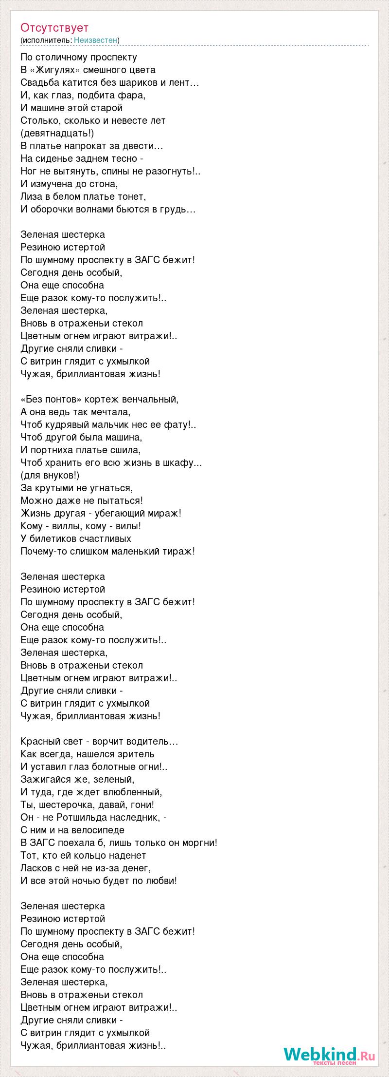 По столичному проспекту В «Жигулях» смешного цвета Свадьба катится без шариков и лент… И, как глаз, подбита фара, И машине этой старой Cтолько, сколько и невесте лет (девятнадцать!) В платье напрокат за двести… На сиденье заднем тесно - Ног не вытянуть, спины не разогнуть!.. И измучена до стона, Лиза в белом платье тонет, И оборочки волнами бьются в грудь… Зеленая шестерка Резиною истертой По шумному проспекту в ЗАГС бежит! Сегодня день особый, Она еще способна Еще разок кому-то послужить!.. Зеленая шестерка, Вновь в отраженьи стекол Цветным огнем играют витражи!.. Другие сняли сливки - С витрин глядит с ухмылкой Чужая, бриллиантовая жизнь! «Без понтов» кортеж венчальный, А она ведь так мечтала, Чтоб кудрявый мальчик нес ее фату!.. Чтоб другой была машина, И портниха платье сшила, Чтоб хранить его всю жизнь в шкафу... (для внуков!) За крутыми не угнаться, Можно даже не пытаться! Жизнь другая - убегающий мираж! Кому - виллы, кому - вилы! У билетиков счастливых Почему-то слишком маленький тираж! Зеленая шестерка Резиною истертой По шумному проспекту в ЗАГС бежит! Сегодня день особый, Она еще способна Еще разок кому-то послужить!.. Зеленая шестерка, Вновь в отраженьи стекол Цветным огнем играют витражи!.. Другие сняли сливки - С витрин глядит с ухмылкой Чужая, бриллиантовая жизнь! Красный свет - ворчит водитель… Как всегда, нашелся зритель И уставил глаз болотные огни!.. Зажигайся же, зеленый, И туда, где ждет влюбленный, Ты, шестерочка, давай, гони! Он - не Ротшильда наследник, - С ним и на велосипеде В ЗАГС поехала б, лишь только он моргни! Тот, кто ей кольцо наденет Ласков с ней не из-за денег, И все этой ночью будет по любви! Зеленая шестерка Резиною истертой По шумному проспекту в ЗАГС бежит! Сегодня день особый, Она еще способна Еще разок кому-то послужить!.. Зеленая шестерка, Вновь в отраженьи стекол Цветным огнем играют витражи!.. Другие сняли сливки - С витрин глядит с ухмылкой Чужая, бриллиантовая жизнь!..