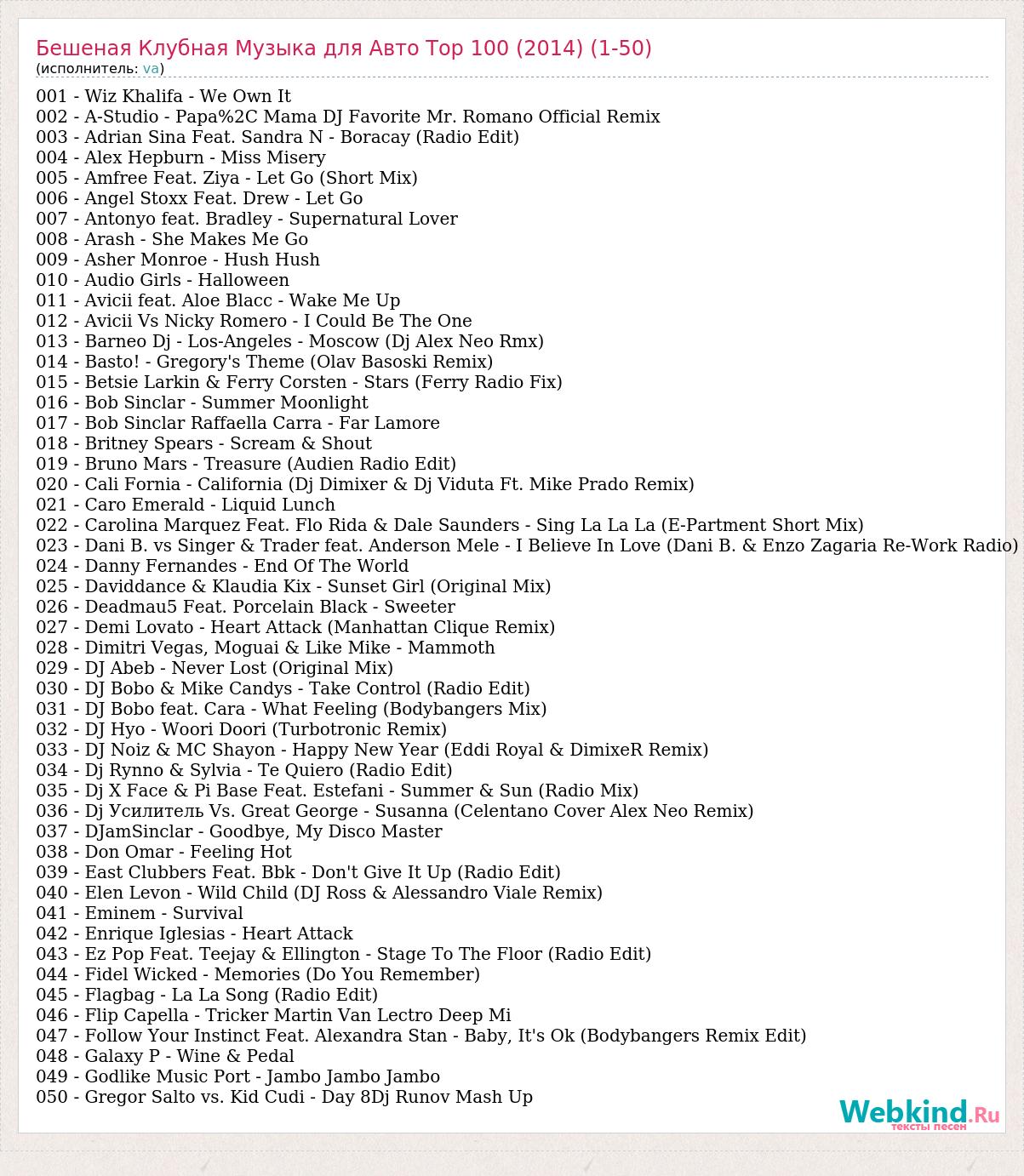 001 - Wiz Khalifa - We Own It 002 - A-Studio - Papa%2C Mama DJ Favorite Mr. Romano Official Remix 003 - Adrian Sina Feat. Sandra N - Boracay (Radio Edit) 004 - Alex Hepburn - Miss Misery 005 - Amfree Feat. Ziya - Let Go (Short Mix) 006 - Angel Stoxx Feat. Drew - Let Go 007 - Antonyo feat. Bradley - Supernatural Lover 008 - Arash - She Makes Me Go 009 - Asher Monroe - Hush Hush 010 - Audio Girls - Halloween 011 - Avicii feat. Aloe Blacc - Wake Me Up 012 - Avicii Vs Nicky Romero - I Could Be The One 013 - Barneo Dj - Los-Angeles - Moscow (Dj Alex Neo Rmx) 014 - Basto! - Gregory's Theme (Olav Basoski Remix) 015 - Betsie Larkin & Ferry Corsten - Stars (Ferry Radio Fix) 016 - Bob Sinclar - Summer Moonlight 017 - Bob Sinclar Raffaella Carra - Far Lamore 018 - Britney Spears - Scream & Shout 019 - Bruno Mars - Treasure (Audien Radio Edit) 020 - Cali Fornia - California (Dj Dimixer & Dj Viduta Ft. Mike Prado Remix) 021 - Caro Emerald - Liquid Lunch 022 - Carolina Marquez Feat. Flo Rida & Dale Saunders - Sing La La La (E-Partment Short Mix) 023 - Dani B. vs Singer & Trader feat. Anderson Mele - I Believe In Love (Dani B. & Enzo Zagaria Re-Work Radio) 024 - Danny Fernandes - End Of The World 025 - Daviddance & Klaudia Kix - Sunset Girl (Original Mix) 026 - Deadmau5 Feat. Porcelain Black - Sweeter 027 - Demi Lovato - Heart Attack (Manhattan Clique Remix) 028 - Dimitri Vegas, Moguai & Like Mike - Mammoth 029 - DJ Abeb - Never Lost (Original Mix) 030 - DJ Bobo & Mike Candys - Take Control (Radio Edit) 031 - DJ Bobo feat. Cara - What Feeling (Bodybangers Mix) 032 - DJ Hyo - Woori Doori (Turbotronic Remix) 033 - DJ Noiz & MC Shayon - Happy New Year (Eddi Royal & DimixeR Remix) 034 - Dj Rynno & Sylvia - Te Quiero (Radio Edit) 035 - Dj X Face & Pi Base Feat. Estefani - Summer & Sun (Radio Mix) 036 - Dj Усилитель Vs. Great George - Susanna (Celentano Cover Alex Neo Remix) 037 - DJamSinclar - Goodbye, My Disco Master 038 - Don Omar - Feeling Hot 039 - East Clubbers Feat. Bbk - Don't Give It Up (Radio Edit) 040 - Elen Levon - Wild Child (DJ Ross & Alessandro Viale Remix) 041 - Eminem - Survival 042 - Enrique Iglesias - Heart Attack 043 - Ez Pop Feat. Teejay & Ellington - Stage To The Floor (Radio Edit) 044 - Fidel Wicked - Memories (Do You Remember) 045 - Flagbag - La La Song (Radio Edit) 046 - Flip Capella - Tricker Martin Van Lectro Deep Mi 047 - Follow Your Instinct Feat. Alexandra Stan - Baby, It's Ok (Bodybangers Remix Edit) 048 - Galaxy P - Wine & Pedal 049 - Godlike Music Port - Jambo Jambo Jambo 050 - Gregor Salto vs. Kid Cudi - Day 8Dj Runov Mash Up