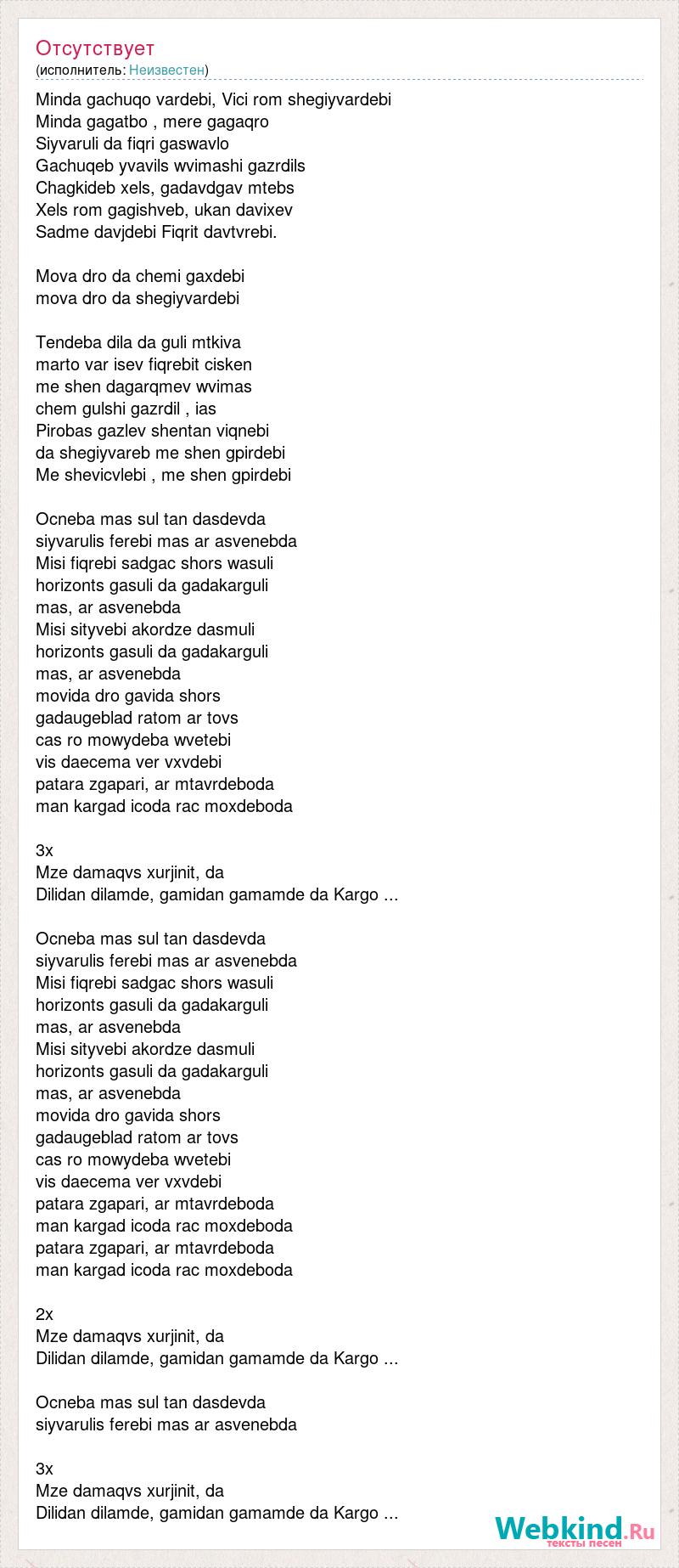 Minda gachuqo vardebi, Vici rom shegiyvardebi Minda gagatbo , mere gagaqro Siyvaruli da fiqri gaswavlo Gachuqeb yvavils wvimashi gazrdils Chagkideb xels, gadavdgav mtebs Xels rom gagishveb, ukan davixev Sadme davjdebi Fiqrit davtvrebi. Mova dro da chemi gaxdebi mova dro da shegiyvardebi Tendeba dila da guli mtkiva marto var isev fiqrebit cisken me shen dagarqmev wvimas chem gulshi gazrdil , ias Pirobas gazlev shentan viqnebi da shegiyvareb me shen gpirdebi Me shevicvlebi , me shen gpirdebi Ocneba mas sul tan dasdevda siyvarulis ferebi mas ar asvenebda Misi fiqrebi sadgac shors wasuli horizonts gasuli da gadakarguli mas, ar asvenebda Misi sityvebi akordze dasmuli horizonts gasuli da gadakarguli mas, ar asvenebda movida dro gavida shors gadaugeblad ratom ar tovs cas ro mowydeba wvetebi vis daecema ver vxvdebi patara zgapari, ar mtavrdeboda man kargad icoda rac moxdeboda 3x Mze damaqvs xurjinit, da Dilidan dilamde, gamidan gamamde da Kargo ... Ocneba mas sul tan dasdevda siyvarulis ferebi mas ar asvenebda Misi fiqrebi sadgac shors wasuli horizonts gasuli da gadakarguli mas, ar asvenebda Misi sityvebi akordze dasmuli horizonts gasuli da gadakarguli mas, ar asvenebda movida dro gavida shors gadaugeblad ratom ar tovs cas ro mowydeba wvetebi vis daecema ver vxvdebi patara zgapari, ar mtavrdeboda man kargad icoda rac moxdeboda patara zgapari, ar mtavrdeboda man kargad icoda rac moxdeboda 2x Mze damaqvs xurjinit, da Dilidan dilamde, gamidan gamamde da Kargo ... Ocneba mas sul tan dasdevda siyvarulis ferebi mas ar asvenebda 3x Mze damaqvs xurjinit, da Dilidan dilamde, gamidan gamamde da Kargo ...
