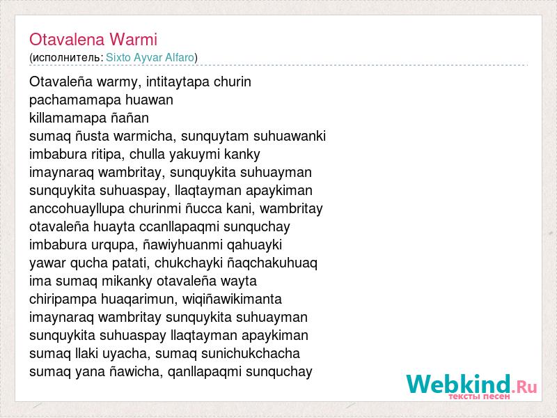 Otavaleña warmy, intitaytapa churin pachamamapa huawan killamamapa ñañan sumaq ñusta warmicha, sunquytam suhuawanki imbabura ritipa, chulla yakuymi kanky imaynaraq wambritay, sunquykita suhuayman sunquykita suhuaspay, llaqtayman apaykiman anccohuayllupa churinmi ñucca kani, wambritay otavaleña huayta ccanllapaqmi sunquchay imbabura urqupa, ñawiyhuanmi qahuayki yawar qucha patati, chukchayki ñaqchakuhuaq ima sumaq mikanky otavaleña wayta chiripampa huaqarimun, wiqiñawikimanta imaynaraq wambritay sunquykita suhuayman sunquykita suhuaspay llaqtayman apaykiman sumaq llaki uyacha, sumaq sunichukchacha sumaq yana ñawicha, qanllapaqmi sunquchay