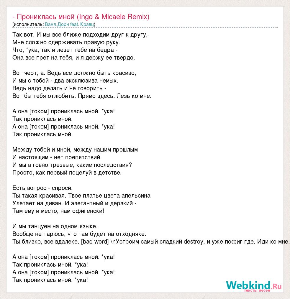 Так вот. И мы все ближе подходим друг к другу, Мне сложно сдерживать правую руку. Что, *ука, так и лезет тебе на бедра - Она все прет на тебя, и я держу ее твердо. Вот черт, а. Ведь все должно быть красиво, И мы с тобой - два эксклюзива немых. Ведь надо делать и не говорить - Вот бы тебя отлюбить. Прямо здесь. Лезь ко мне. А она [током] прониклась мной. *ука! Так прониклась мной. А она [током] прониклась мной. *ука! Так прониклась мной. Между тобой и мной, между нашим прошлым И настоящим - нет препятствий. И мы в говно трезвые, какие последствия? Просто, как первый поцелуй в детстве. Есть вопрос - спроси. Ты такая красивая. Твое платье цвета апельсина Улетает на диван. И элегантный и дерзкий - Там ему и место, нам офигенски! И мы танцуем на одном языке. Вообще не парюсь, что там будет на отходняке. Ты близко, все вдалеке. [bad word] \nУстроим самый сладкий destroy, и уже пофиг где. Иди ко мне. А она [током] прониклась мной. *ука! Так прониклась мной. *ука! А она [током] прониклась мной. *ука! Так прониклась мной. *ука!