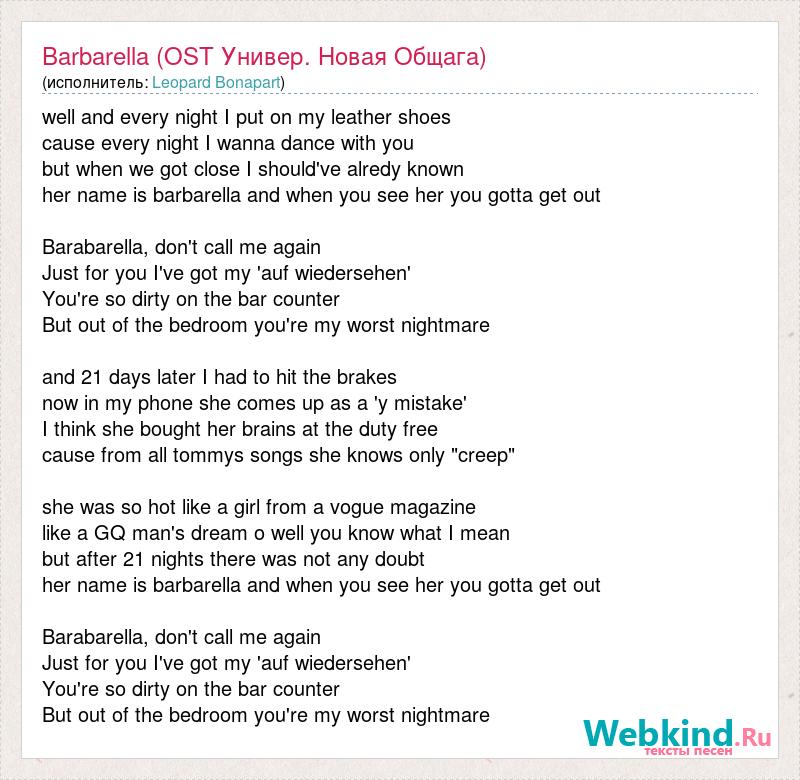 well and every night I put on my leather shoes cause every night I wanna dance with you but when we got close I should've alredy known her name is barbarella and when you see her you gotta get out Barabarella, don't call me again Just for you I've got my 'auf wiedersehen' You're so dirty on the bar counter But out of the bedroom you're my worst nightmare and 21 days later I had to hit the brakes now in my phone she comes up as a 'y mistake' I think she bought her brains at the duty free cause from all tommys songs she knows only "creep" she was so hot like a girl from a vogue magazine like a GQ man's dream o well you know what I mean but after 21 nights there was not any doubt her name is barbarella and when you see her you gotta get out Barabarella, don't call me again Just for you I've got my 'auf wiedersehen' You're so dirty on the bar counter But out of the bedroom you're my worst nightmare