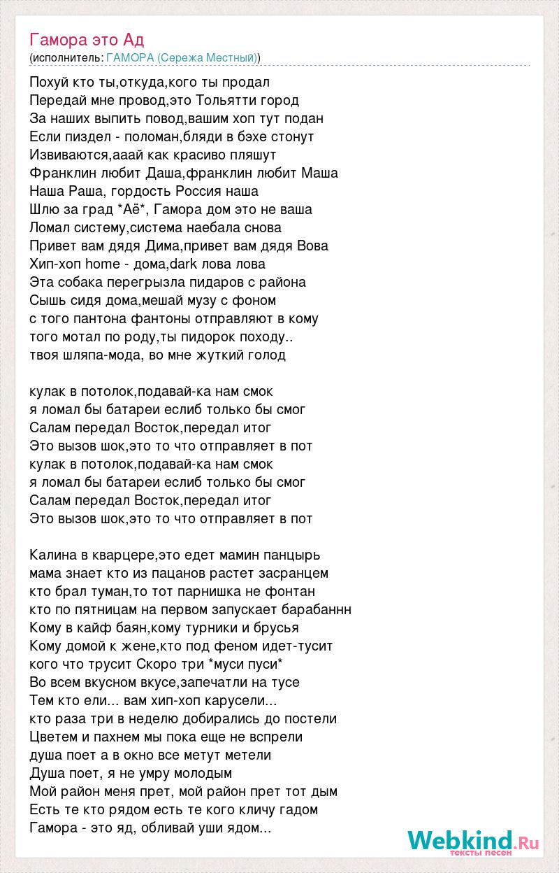 Похуй кто ты,откуда,кого ты продал Передай мне провод,это Тольятти город За наших выпить повод,вашим хоп тут подан Если пиздел - поломан,бляди в бэхе стонут Извиваются,ааай как красиво пляшут Франклин любит Даша,франклин любит Маша Наша Раша, гордость Россия наша Шлю за град *Аё*, Гамора дом это не ваша Ломал систему,система наебала снова Привет вам дядя Дима,привет вам дядя Вова Хип-хоп homе - дома,dark лова лова Эта собака перегрызла пидаров с района Сышь сидя дома,мешай музу с фоном с того пантона фантоны отправляют в кому того мотал по роду,ты пидорок походу.. твоя шляпа-мода, во мне жуткий голод кулак в потолок,подавай-ка нам смок я ломал бы батареи еслиб только бы смог Салам передал Восток,передал итог Это вызов шок,это то что отправляет в пот кулак в потолок,подавай-ка нам смок я ломал бы батареи еслиб только бы смог Салам передал Восток,передал итог Это вызов шок,это то что отправляет в пот Калина в кварцере,это едет мамин панцырь мама знает кто из пацанов растет засранцем кто брал туман,то тот парнишка не фонтан кто по пятницам на первом запускает барабаннн Кому в кайф баян,кому турники и брусья Кому домой к жене,кто под феном идет-тусит кого что трусит Скоро три *муси пуси* Во всем вкусном вкусе,запечатли на тусе Тем кто ели... вам хип-хоп карусели... кто раза три в неделю добирались до постели Цветем и пахнем мы пока еще не вспрели душа поет а в окно все метут метели Душа поет, я не умру молодым Мой район меня прет, мой район прет тот дым Есть те кто рядом есть те кого кличу гадом Гамора - это яд, обливай уши ядом...