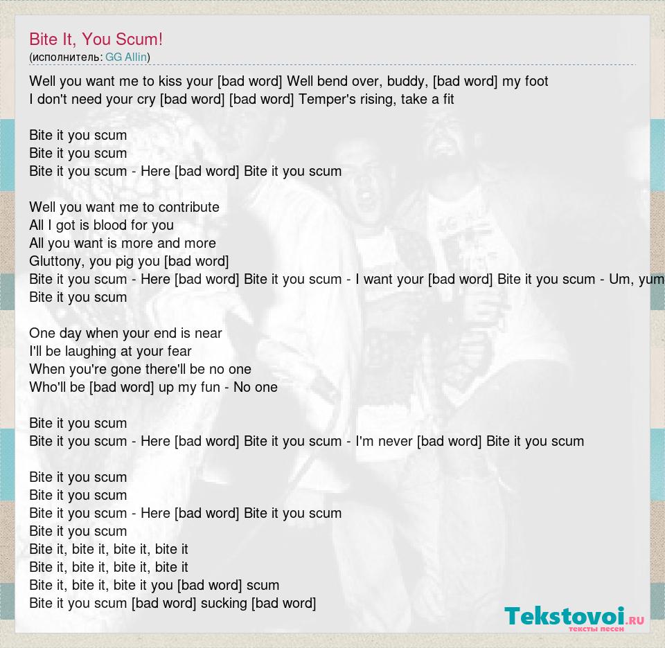 Well you want me to kiss your [bad word] Well bend over, buddy, here comes my foot I don't need your cry [bad word] [bad word] Temper's rising, take a fit Bite it you scum Bite it you scum Bite it you scum - Here I come Bite it you scum Well you want me to contribute All I got is blood for you All you want is more and more Gluttony, you pig you [bad word] Bite it you scum - Here I come Bite it you scum - I want your [bad word] Bite it you scum - Um, yum Bite it you scum One day when your end is near I'll be laughing at your fear When you're gone there'll be no one Who'll be [bad word] up my fun - No one Bite it you scum Bite it you scum - Here I come Bite it you scum - I'm never gonna run Bite it you scum Bite it you scum Bite it you scum Bite it you scum - Here I come Bite it you scum Bite it you scum Bite it, bite it, bite it, bite it Bite it, bite it, bite it, bite it Bite it, bite it, bite it you [bad word] scum Bite it you scum [bad word] sucking [bad word]