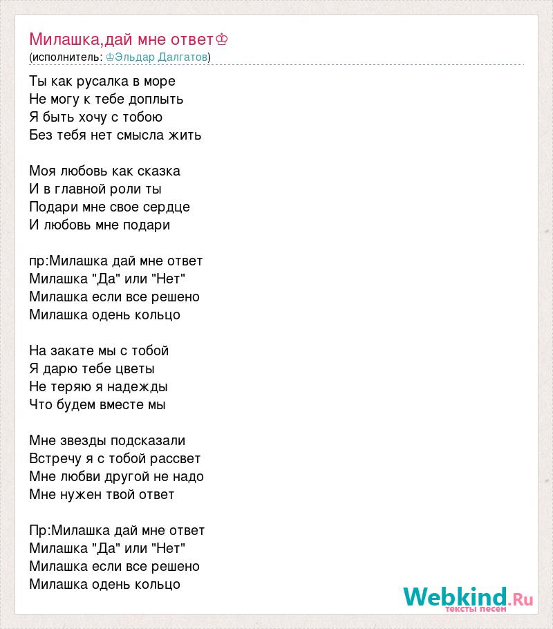 Ты как русалка в море Не могу к тебе доплыть Я быть хочу с тобою Без тебя нет смысла жить Моя любовь как сказка И в главной роли ты Подари мне свое сердце И любовь мне подари пр:Милашка дай мне ответ Милашка "Да" или "Нет" Милашка если все решено Милашка одень кольцо На закате мы с тобой Я дарю тебе цветы Не теряю я надежды Что будем вместе мы Мне звезды подсказали Встречу я с тобой рассвет Мне любви другой не надо Мне нужен твой ответ Пр:Милашка дай мне ответ Милашка "Да" или "Нет" Милашка если все решено Милашка одень кольцо