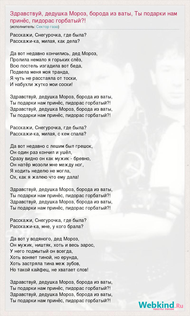 Расскажи, Снегурочка, где была? Расскажи-ка, милая, как дела? Да вот недавно кончились, дед Мороз, Пролила немало я горьких слёз, Всю постель изгадила вот беда, Подвела меня моя транда, Я чуть не расстаяла от тоски, И набухли жутко мои соски! Здравствуй, дедушка Мороз, борода из ваты, Ты подарки нам принёс, пидораc горбатый?! Здравствуй, дедушка Мороз, борода из ваты, Ты подарки нам принёс, пидораc горбатый?! Расскажи, Снегурочка, где была? Расскажи-ка, милая, с кем спала? Да вот недавно с лешим был грешок, Он один раз кончил и ушёл, Сразу видно он как мужик - бревно, Он натёр мозоли мне между ног, Я ходить неделю не могла, Ох, как я жалею что ему дала! Здравствуй, дедушка Мороз, борода из ваты, Ты подарки нам принёс, пидораc горбатый?! Здравствуй, дедушка Мороз, борода из ваты, Ты подарки нам принёс, пидораc горбатый?! Расскажи, Снегурочка, где была? Расскажи-ка, мне, у кого брала? Да вот у водяного, дед Мороз, Он мужик, ништяк, хоть и весь зарос, У него подмытый он всегда, Хоть воняет тиной, но ерунда, Хоть застряла тина меж зубов, Но такой кайфец, не хватает слов! Здравствуй, дедушка Мороз, борода из ваты, Ты подарки нам принёс, пидораc горбатый?! Здравствуй, дедушка Мороз, борода из ваты, Ты подарки нам принёс, пидораc горбатый?!