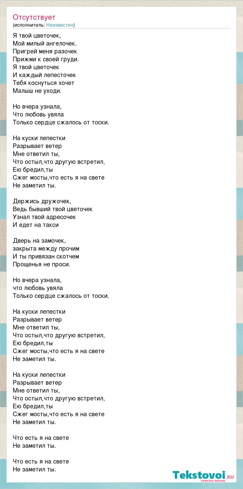 Я твой цветочек, Мой милый ангелочек. Пригрей меня разочек Прижми к своей груди. Я твой цветочек И каждый лепесточек Тебя коснуться хочет Малыш не уходи. Но вчера узнала, Что любовь увяла Только сердце сжалось от тоски. На куски лепестки Разрывает ветер Мне ответил ты, Что остыл,что другую встретил, Ею бредил,ты Сжег мосты,что есть я на свете Не заметил ты. Держись дружочек, Ведь бывший твой цветочек Узнал твой адресочек И едет на такси Дверь на замочек, закрыта между прочим И ты привязан скотчем Прощенья не проси. Но вчера узнала, что любовь увяла Только сердце сжалось от тоски. На куски лепестки Разрывает ветер Мне ответил ты, Что остыл,что другую встретил, Ею бредил,ты Сжег мосты,что есть я на свете Не заметил ты. На куски лепестки Разрывает ветер Мне ответил ты, Что остыл,что другую встретил, Ею бредил,ты Сжег мосты,что есть я на свете Не заметил ты. Что есть я на свете Не заметил ты. Что есть я на свете Не заметил ты.