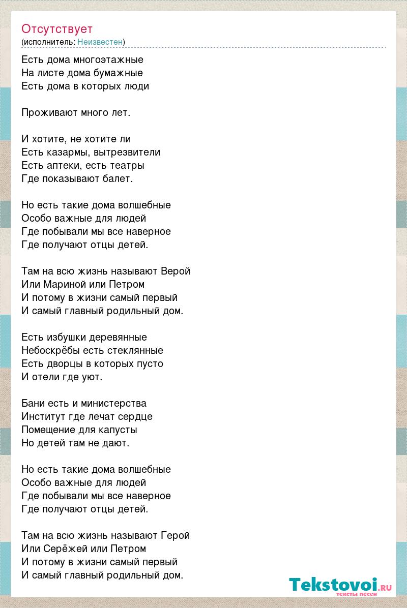 Есть дома многоэтажные На листе дома бумажные Есть дома в которых люди Проживают много лет. И хотите, не хотите ли Есть казармы, вытрезвители Есть аптеки, есть театры Где показывают балет. Но есть такие дома волшебные Особо важные для людей Где побывали мы все наверное Где получают отцы детей. Там на всю жизнь называют Верой Или Мариной или Петром И потому в жизни самый первый И самый главный родильный дом. Есть избушки деревянные Небоскрёбы есть стеклянные Есть дворцы в которых пусто И отели где уют. Бани есть и министерства Институт где лечат сердце Помещение для капусты Но детей там не дают. Но есть такие дома волшебные Особо важные для людей Где побывали мы все наверное Где получают отцы детей. Там на всю жизнь называют Герой Или Серёжей или Петром И потому в жизни самый первый И самый главный родильный дом.
