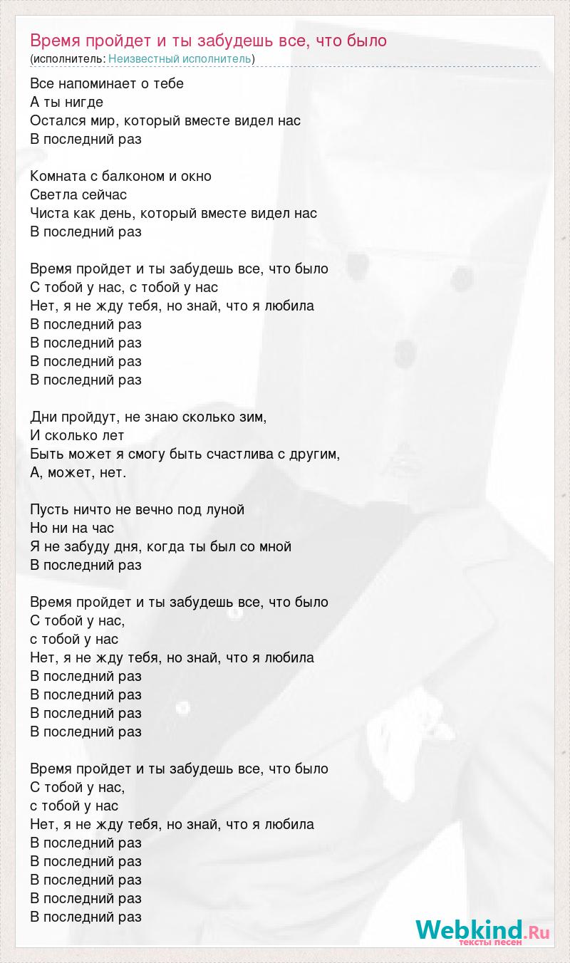 Все напоминает о тебе А ты нигде Остался мир, который вместе видел нас В последний раз Комната с балконом и окно Светла сейчас Чиста как день, который вместе видел нас В последний раз Время пройдет и ты забудешь все, что было С тобой у нас, с тобой у нас Нет, я не жду тебя, но знай, что я любила В последний раз В последний раз В последний раз В последний раз Дни пройдут, не знаю сколько зим, И сколько лет Быть может я смогу быть счастлива с другим, А, может, нет. Пусть ничто не вечно под луной Но ни на час Я не забуду дня, когда ты был со мной В последний раз Время пройдет и ты забудешь все, что было С тобой у нас, с тобой у нас Нет, я не жду тебя, но знай, что я любила В последний раз В последний раз В последний раз В последний раз Время пройдет и ты забудешь все, что было С тобой у нас, с тобой у нас Нет, я не жду тебя, но знай, что я любила В последний раз В последний раз В последний раз В последний раз В последний раз