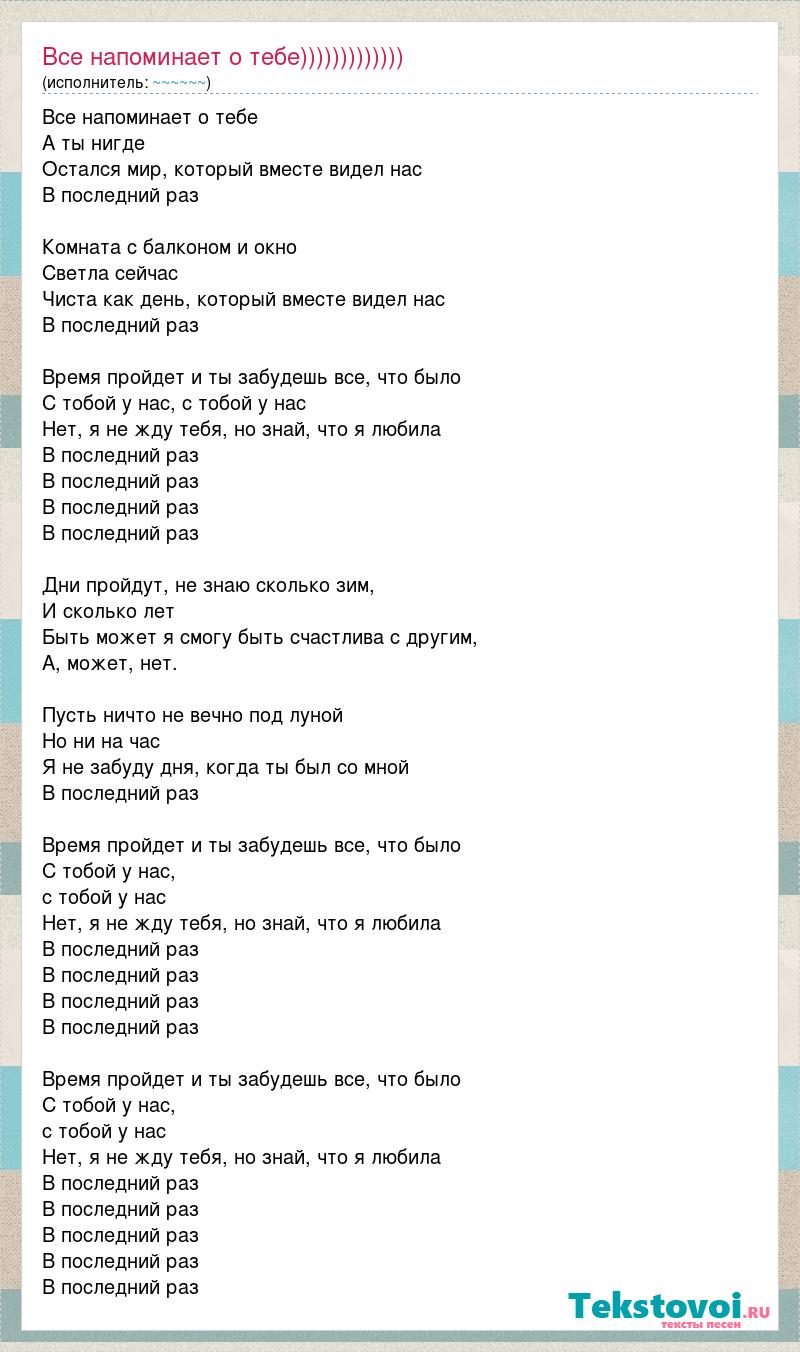 Все напоминает о тебе А ты нигде Остался мир, который вместе видел нас В последний раз Комната с балконом и окно Светла сейчас Чиста как день, который вместе видел нас В последний раз Время пройдет и ты забудешь все, что было С тобой у нас, с тобой у нас Нет, я не жду тебя, но знай, что я любила В последний раз В последний раз В последний раз В последний раз Дни пройдут, не знаю сколько зим, И сколько лет Быть может я смогу быть счастлива с другим, А, может, нет. Пусть ничто не вечно под луной Но ни на час Я не забуду дня, когда ты был со мной В последний раз Время пройдет и ты забудешь все, что было С тобой у нас, с тобой у нас Нет, я не жду тебя, но знай, что я любила В последний раз В последний раз В последний раз В последний раз Время пройдет и ты забудешь все, что было С тобой у нас, с тобой у нас Нет, я не жду тебя, но знай, что я любила В последний раз В последний раз В последний раз В последний раз В последний раз