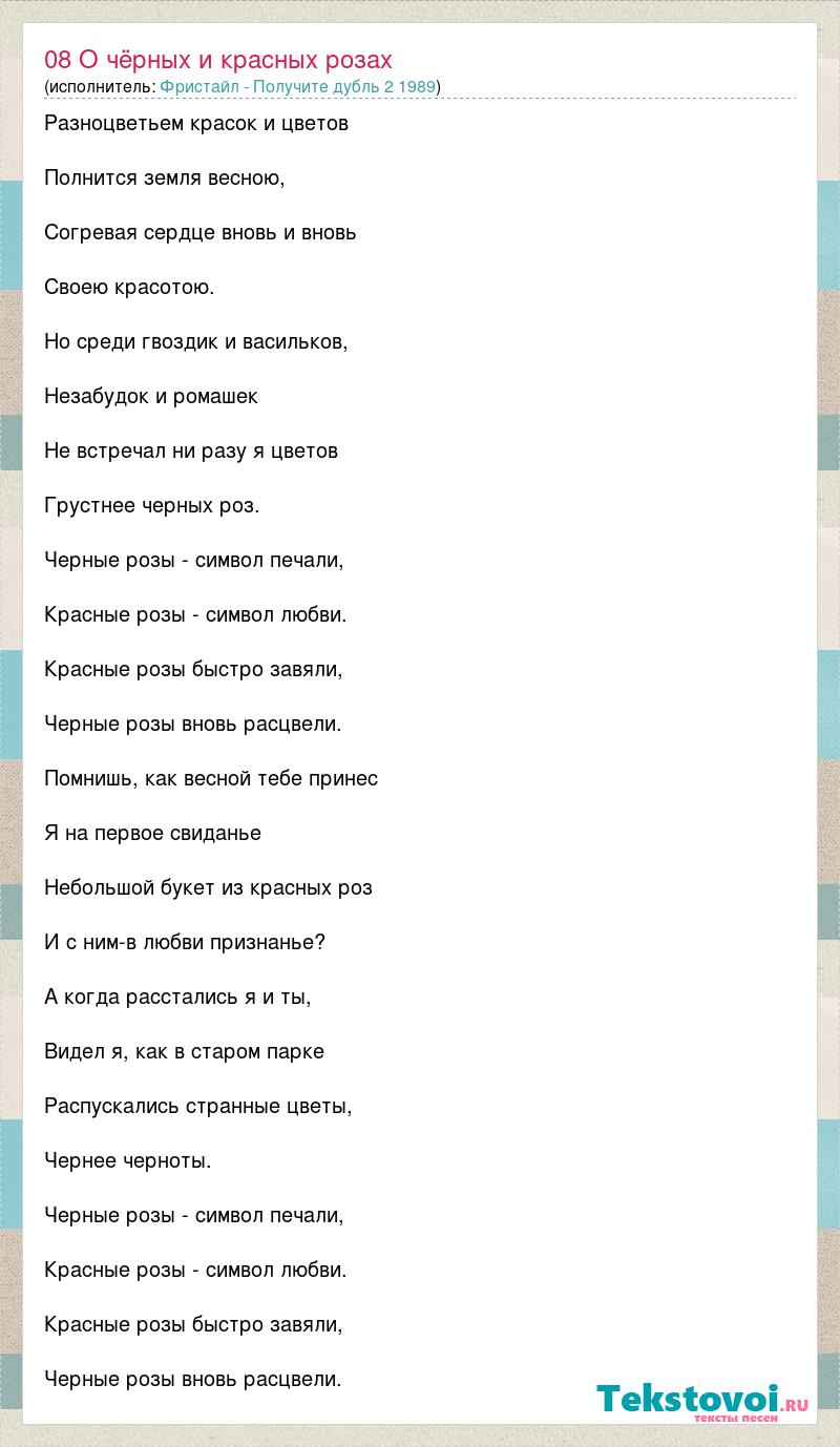 Разноцветьем красок и цветов Полнится земля весною, Согревая сердце вновь и вновь Своею красотою. Но среди гвоздик и васильков, Незабудок и ромашек Не встречал ни разу я цветов Грустнее черных роз. Черные розы - символ печали, Красные розы - символ любви. Красные розы быстро завяли, Черные розы вновь расцвели. Помнишь, как весной тебе принес Я на первое свиданье Небольшой букет из красных роз И с ним-в любви признанье? А когда расстались я и ты, Видел я, как в старом парке Распускались странные цветы, Чернее черноты. Черные розы - символ печали, Красные розы - символ любви. Красные розы быстро завяли, Черные розы вновь расцвели.