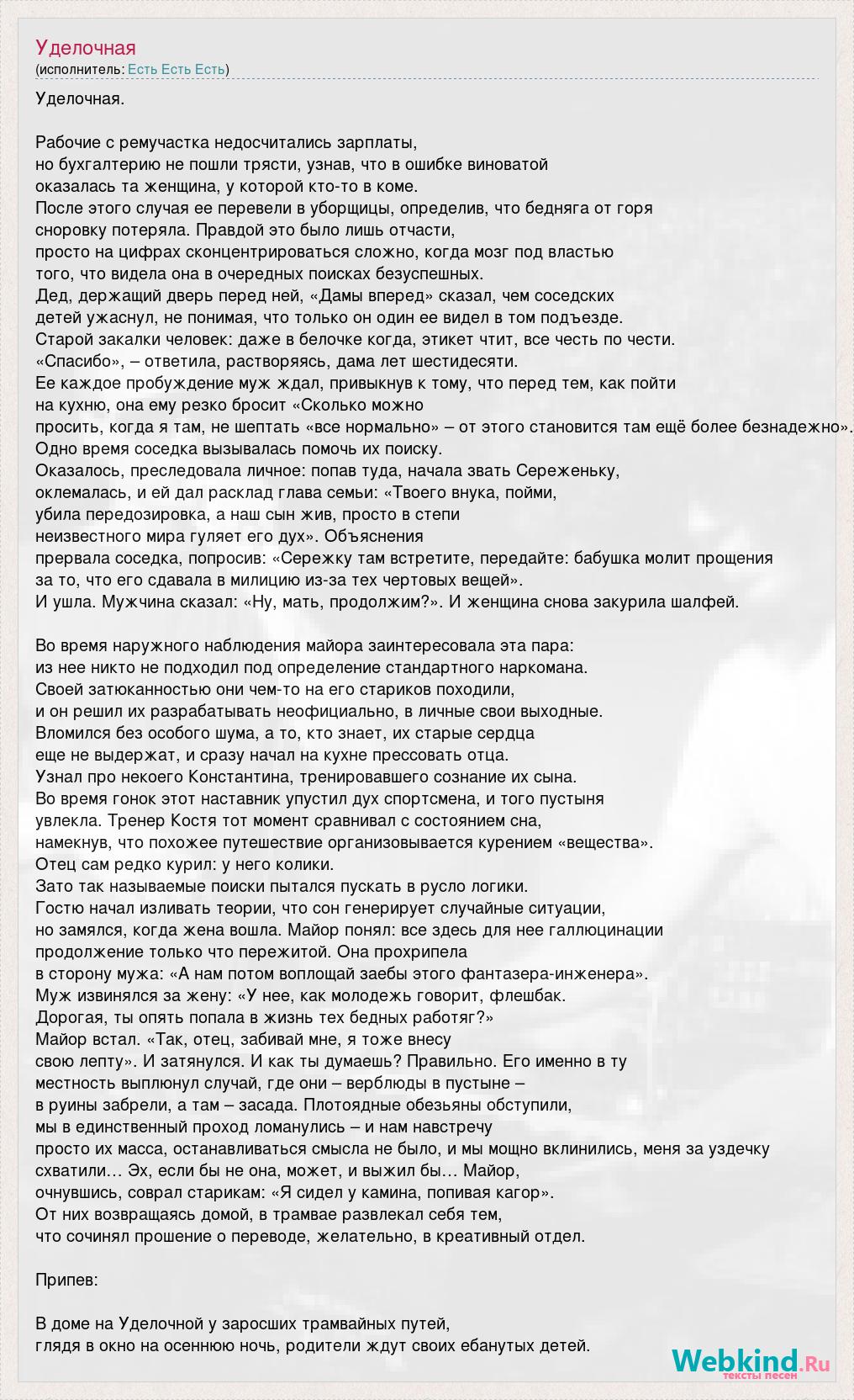 Уделочная. Рабочие с ремучастка недосчитались зарплаты, но бухгалтерию не пошли трясти, узнав, что в ошибке виноватой оказалась та женщина, у которой кто-то в коме. После этого случая ее перевели в уборщицы, определив, что бедняга от горя сноровку потеряла. Правдой это было лишь отчасти, просто на цифрах сконцентрироваться сложно, когда мозг под властью того, что видела она в очередных поисках безуспешных. Дед, держащий дверь перед ней, «Дамы вперед» сказал, чем соседских детей ужаснул, не понимая, что только он один ее видел в том подъезде. Старой закалки человек: даже в белочке когда, этикет чтит, все честь по чести. «Спасибо», – ответила, растворяясь, дама лет шестидесяти. Ее каждое пробуждение муж ждал, привыкнув к тому, что перед тем, как пойти на кухню, она ему резко бросит «Сколько можно просить, когда я там, не шептать «все нормально» – от этого становится там ещё более безнадежно». Одно время соседка вызывалась помочь их поиску. Оказалось, преследовала личное: попав туда, начала звать Сереженьку, оклемалась, и ей дал расклад глава семьи: «Твоего внука, пойми, убила передозировка, а наш сын жив, просто в степи неизвестного мира гуляет его дух». Объяснения прервала соседка, попросив: «Сережку там встретите, передайте: бабушка молит прощения за то, что его сдавала в милицию из-за тех чертовых вещей». И ушла. Мужчина сказал: «Ну, мать, продолжим?». И женщина снова закурила шалфей. Во время наружного наблюдения майора заинтересовала эта пара: из нее никто не подходил под определение стандартного наркомана. Своей затюканностью они чем-то на его стариков походили, и он решил их разрабатывать неофициально, в личные свои выходные. Вломился без особого шума, а то, кто знает, их старые сердца еще не выдержат, и сразу начал на кухне прессовать отца. Узнал про некоего Константина, тренировавшего сознание их сына. Во время гонок этот наставник упустил дух спортсмена, и того пустыня увлекла. Тренер Костя тот момент сравнивал с состоянием сна, намекнув, что похожее путешествие организовывается курением «вещества». Отец сам редко курил: у него колики. Зато так называемые поиски пытался пускать в русло логики. Гостю начал изливать теории, что сон генерирует случайные ситуации, но замялся, когда жена вошла. Майор понял: все здесь для нее галлюцинации продолжение только что пережитой. Она прохрипела в сторону мужа: «А нам потом воплощай заебы этого фантазера-инженера». Муж извинялся за жену: «У нее, как молодежь говорит, флешбак. Дорогая, ты опять попала в жизнь тех бедных работяг?» Майор встал. «Так, отец, забивай мне, я тоже внесу свою лепту». И затянулся. И как ты думаешь? Правильно. Его именно в ту местность выплюнул случай, где они – верблюды в пустыне – в руины забрели, а там – засада. Плотоядные обезьяны обступили, мы в единственный проход ломанулись – и нам навстречу просто их масса, останавливаться смысла не было, и мы мощно вклинились, меня за уздечку схватили… Эх, если бы не она, может, и выжил бы… Майор, очнувшись, соврал старикам: «Я сидел у камина, попивая кагор». От них возвращаясь домой, в трамвае развлекал себя тем, что сочинял прошение о переводе, желательно, в креативный отдел. Припев: В доме на Уделочной у заросших трамвайных путей, глядя в окно на осеннюю ночь, родители ждут своих ебанутых детей.