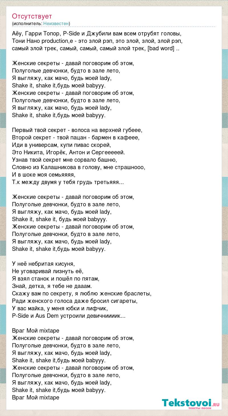 Аёу, Гарри Топор, P-Side и Джубили вам всем отрубят головы, Тони Нано production,е - это злой рэп, это злой, злой, злой рэп, самый злой трек, самый, самый, самый злой трек, [bad word] .. Женские секреты - давай поговорим об этом, Полуголые девчонки, будто в зале лето, Я выгляжу, как мачо, будь моей lady, Shake it, shake it,будь моей babyyy. Женские секреты - давай поговорим об этом, Полуголые девчонки, будто в зале лето, Я выгляжу, как мачо, будь моей lady, Shake it, shake it,будь моей babyyy. Первый твой секрет - волоса на верхней губеее, Второй секрет - твой пацан - бармен в кафеее, Иди в универсам, купи пивас скорей, Это Никита, Игорёк, Антон и Сергееееей. Узнав твой секрет мне сорвало башню, Словно из Калашникова в голову, мне страшнооо, И в шоке моя семьяяяя, Т.к между двумя у тебя грудь третьяяя... Женские секреты - давай поговорим об этом, Полуголые девчонки, будто в зале лето, Я выгляжу, как мачо, будь моей lady, Shake it, shake it, будь моей babyyy. Женские секреты - давай поговорим об этом, Полуголые девчонки, будто в зале лето, Я выгляжу, как мачо, будь моей lady, Shake it, shake it,будь моей babyyy. У неё небритая кисуня, Не уговаривай лизнуть её, Я взял станок и пошёл по пятам, Знай, детка, я тебе не дааам. Скажу вам по секрету, я люблю женские браслеты, Ради женского голоса даже бросил сигареты, У вас майка, у меня юбки и лифчик, P-Side и Aus Dem устроили девичниииик... Враг Мой mixtape Женские секреты - давай поговорим об этом, Полуголые девчонки, будто в зале лето, Я выгляжу, как мачо, будь моей lady, Shake it, shake it,будь моей babyyy. Женские секреты - давай поговорим об этом, Полуголые девчонки, будто в зале лето, Я выгляжу, как мачо, будь моей lady, Shake it, shake it,будь моей babyyy. Враг Мой mixtape