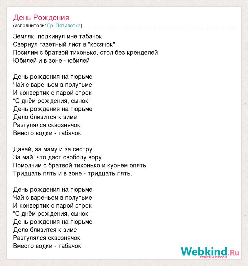 Земляк, подкинул мне табачок Свернул газетный лист в "косячок" Посилим с братвой тихонько, стол без кренделей Юбилей и в зоне - юбилей День рождения на тюрьме Чай с вареньем в полутьме И конвертик с парой строк "С днём рождения, сынок" День рождения на тюрьме Дело близится к зиме Разгулялся сквознячок Вместо водки - табачок Давай, за маму и за сестру За май, что даст свободу вору Помолчим с братвой тихонько и курнём опять Тридцать пять и в зоне - тридцать пять. День рождения на тюрьме Чай с вареньем в полутьме И конвертик с парой строк "С днём рождения, сынок" День рождения на тюрьме Дело близится к зиме Разгулялся сквознячок Вместо водки - табачок