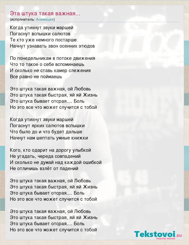 Когда утихнут звуки маршей Погаснут вспышки салютов Те кто уже немного постарше Начнут узнавать звон осенних этюдов По понедельникам в потоке движения Что то такое о себе вспоминаешь И сколько не ставь камер слежения Все равно не поймаешь Это штука такая важная, ой Любовь Это штука такая быстрая, яй яй Жизнь Это штука бывает отсрая.... Боль Но это все что может случится с тобой Когда утихнут звуки маршей Погаснут ярких салютов вспышки Что было до и что будет дальше Начнут нам шептать умные книжки Кого, кто одарит на дорогу улыбкой Не угадать, череда совпадений И сколько не думай над каждой ошибкой Не отличишь взлёт от падений Это штука такая важная, ой Любовь Это штука такая быстрая, яй яй Жизнь Это штука бывает отсрая.... Боль Но это все что может случится с тобой Это штука такая важная, ой Любовь Это штука такая быстрая, яй яй Жизнь Это штука бывает отсрая.... Боль Но это все что может случится с тобой