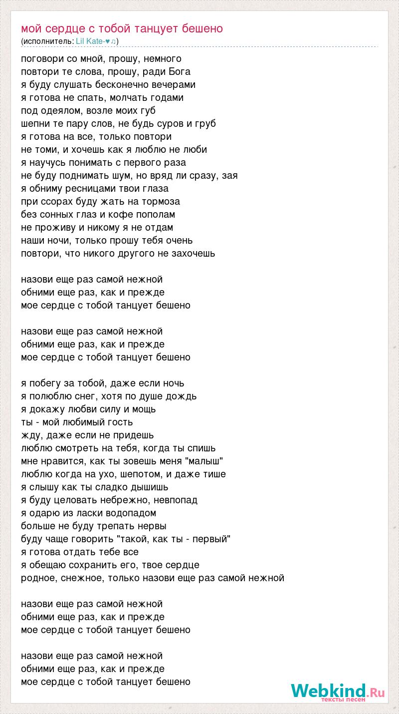 поговори со мной, прошу, немного повтори те слова, прошу, ради Бога я буду слушать бесконечно вечерами я готова не спать, молчать годами под одеялом, возле моих губ шепни те пару слов, не будь суров и груб я готова на все, только повтори не томи, и хочешь как я люблю не люби я научусь понимать с первого раза не буду поднимать шум, но вряд ли сразу, зая я обниму ресницами твои глаза при ссорах буду жать на тормоза без сонных глаз и кофе пополам не проживу и никому я не отдам наши ночи, только прошу тебя очень повтори, что никого другого не захочешь назови еще раз самой нежной обними еще раз, как и прежде мое сердце с тобой танцует бешено назови еще раз самой нежной обними еще раз, как и прежде мое сердце с тобой танцует бешено я побегу за тобой, даже если ночь я полюблю снег, хотя по душе дождь я докажу любви силу и мощь ты - мой любимый гость жду, даже если не придешь люблю смотреть на тебя, когда ты спишь мне нравится, как ты зовешь меня "малыш" люблю когда на ухо, шепотом, и даже тише я слышу как ты сладко дышишь я буду целовать небрежно, невпопад я одарю из ласки водопадом больше не буду трепать нервы буду чаще говорить "такой, как ты - первый" я готова отдать тебе все я обещаю сохранить его, твое сердце родное, снежное, только назови еще раз самой нежной назови еще раз самой нежной обними еще раз, как и прежде мое сердце с тобой танцует бешено назови еще раз самой нежной обними еще раз, как и прежде мое сердце с тобой танцует бешено