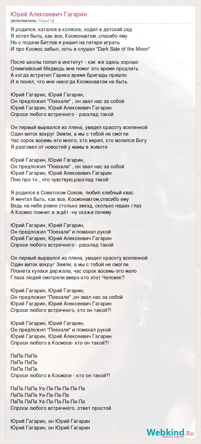 Я родился, катался в коляске, ходил в детский сад Я хотел быть, как все, Космонавтом ,спасибо ему Но с подачи Битлов я решил на гитаре играть И про Космос забыл, хоть и слушал "Dark Side of the Moon" После школы попал в институт - как же здесь хорошо Олимпийский Mедведь мне помог это время продлить А когда встретил Гарика время Бригады пришло И я понял, что мне никогда Космонавтом не быть Юрий Гагарин, Юрий Гагарин, Он предложил "Поехали" , он звал нас за собой Юрий Гагарин, Юрий Алексеевич Гагарин Спроси любого встречного - расклад такой Он первый вырвался из плена, увидел красоту вселенной Один виток вокруг Земли, а мы с тобой не смогли Час сорок восемь-это много, кто верил, кто молился Богу Я разговел от новостей у мамы в животе Юрий Гагарин, Юрий Гагарин, Он предложил "Поехали" , он звал нас за собой Юрий Гагарин, Юрий Алексеевич Гагарин Пою про то , что чувствую,расклад такой Я родился в Советском Союзе, любил хлебный квас Я мечтал быть, как все, Космонавтом,спасибо ему Ведь на небе ровно столько звезд, сколько наших глаз А Космос помнит и ждёт -ну скажи почему Юрий Гагарин, Юрий Гагарин, Он предложил "Поехали" и помахал рукой Юрий Гагарин, Юрий Алексеевич Гагарин Спроси любого встречного - расклад такой Он первый вырвался из плена, увидел красоту вселенной Один виток вокруг Земли, а мы с тобой не смогли Планета кулаки держала, час сорок восемь-это мало Глаза людей смотрели вверх-кто этот Человек? Юрий Гагарин, Юрий Гагарин, Он предложил "Поехали" ,он звал нас за собой Юрий Гагарин, Юрий Алексеевич Гагарин Спроси любого встречного, кто он такой?! Юрий Гагарин, Юрий Гагарин, Он предложил "Поехали" и помахал рукой Юрий Гагарин, Юрий Алексеевич Гагарин Спроси любого в Космосе- кто он такой?! ПаПа ПаПа ПаПа ПаПа ПаПа ПаПа Спроси любого в Космосе - кто он такой?! ПаПа ПаПа Уа-Па-Па-Па-Па-Па ПаПа ПаПа Уа-Па-Па-Па ПаПа ПаПа Уа-Па-Па-Па-Па-Па Спроси любого встречного, ответ простой Юрий Гагарин, он Юрий Гагарин Юрий Гагарин, он Юрий Гагарин